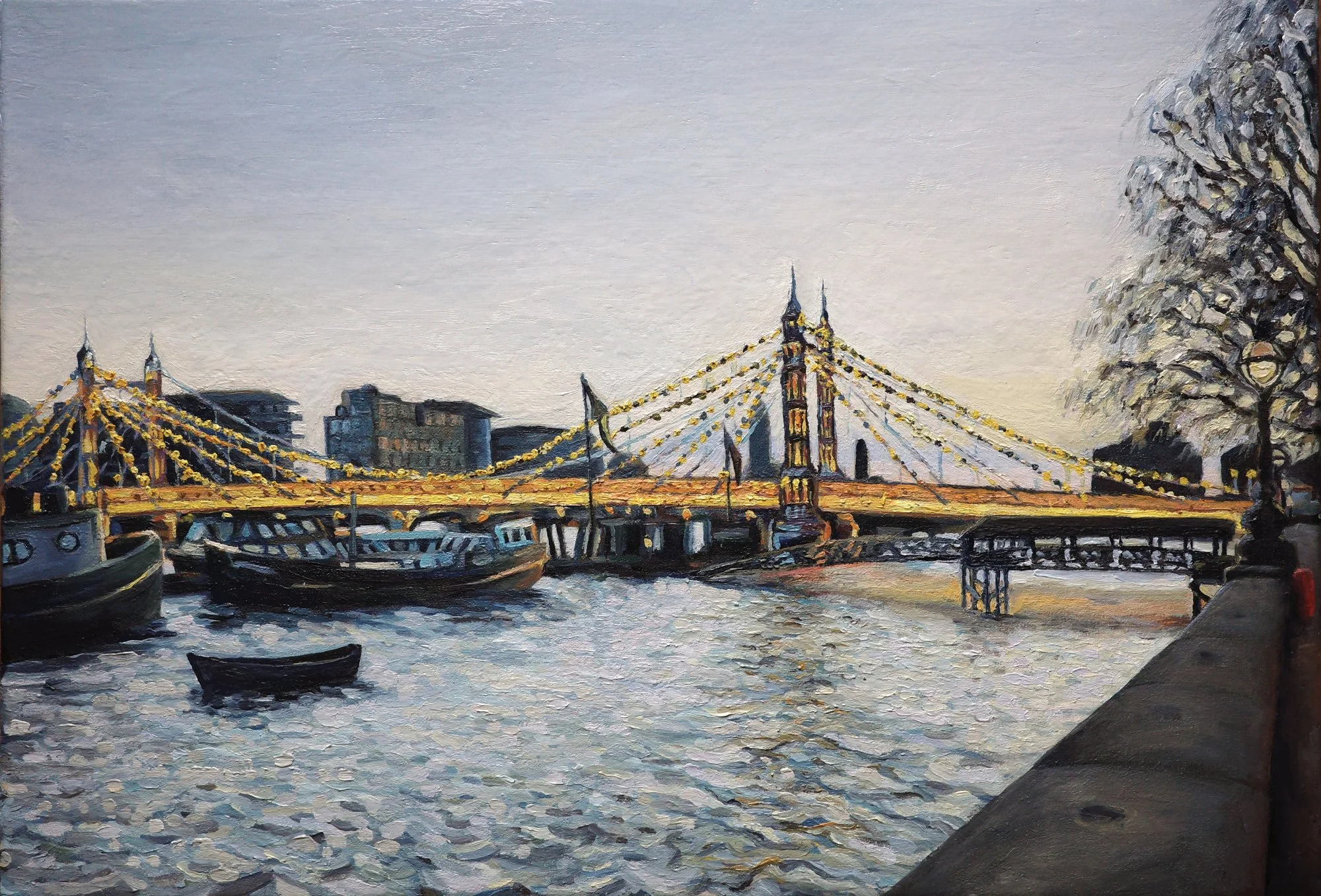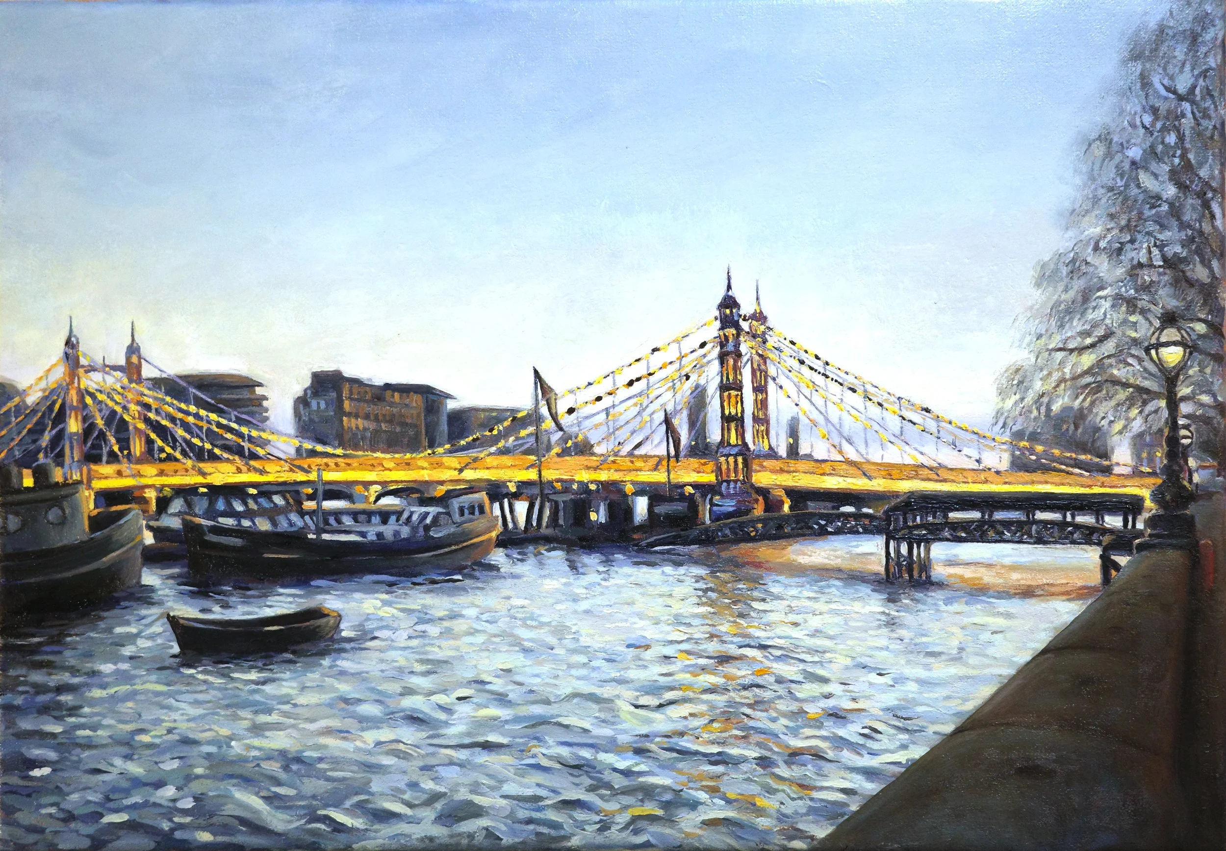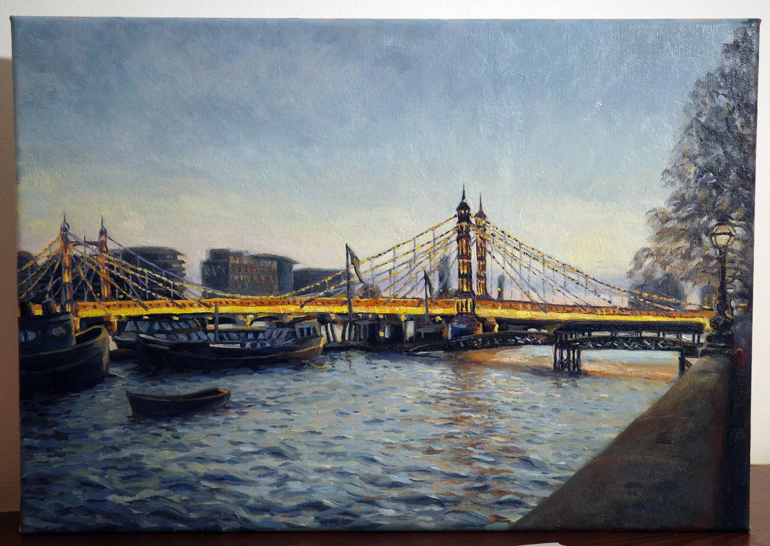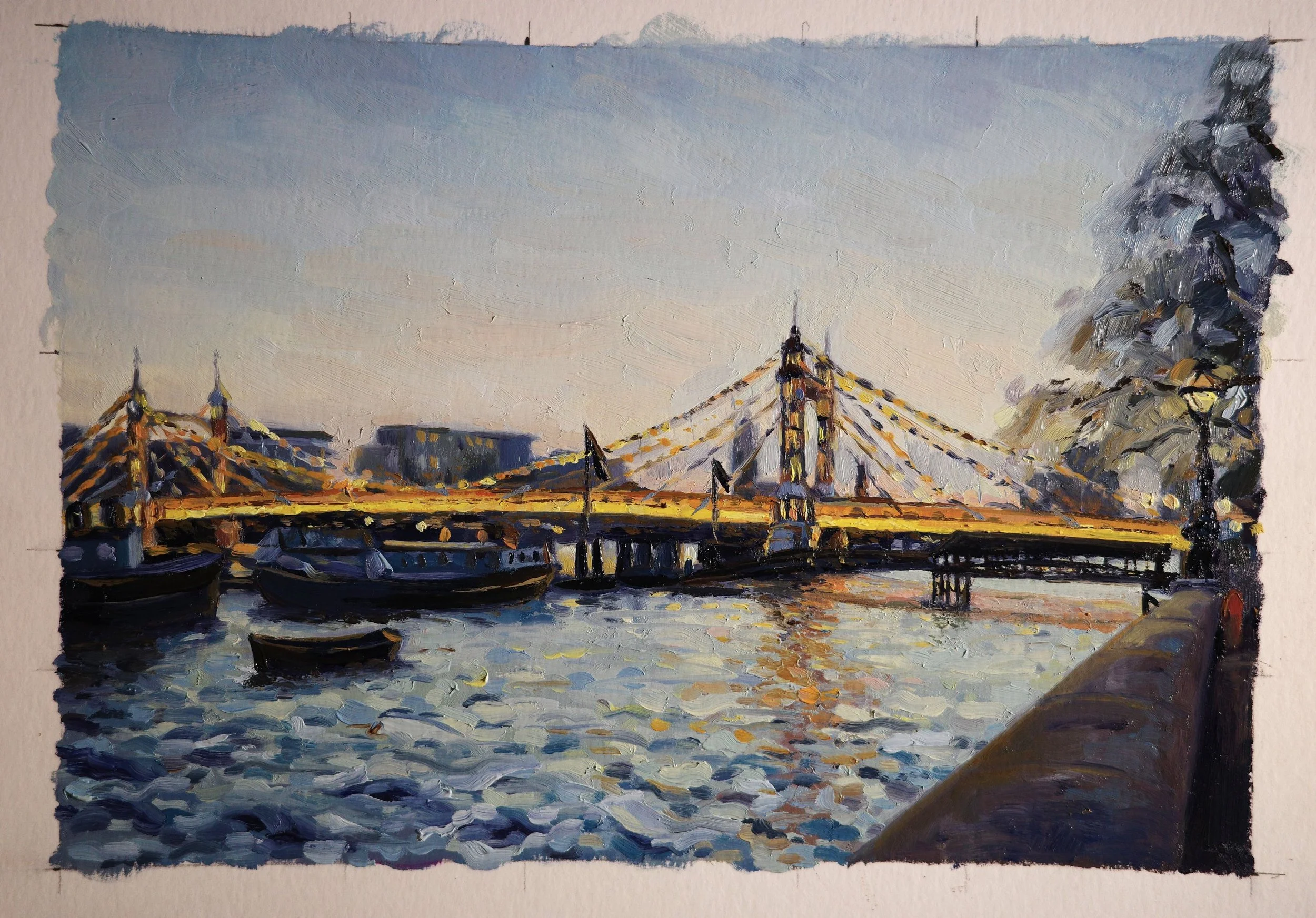 My client commissioned me to paint Albert Bridge at dusk to commemorate her time living in London, as she prepared to move back to Spain. She wanted to capture the lights of the bridge against the grey evening, with the river, its boats and the classic street lights. She was inspired by a painting I did a few years ago of the same scene, which we used as a starting point.