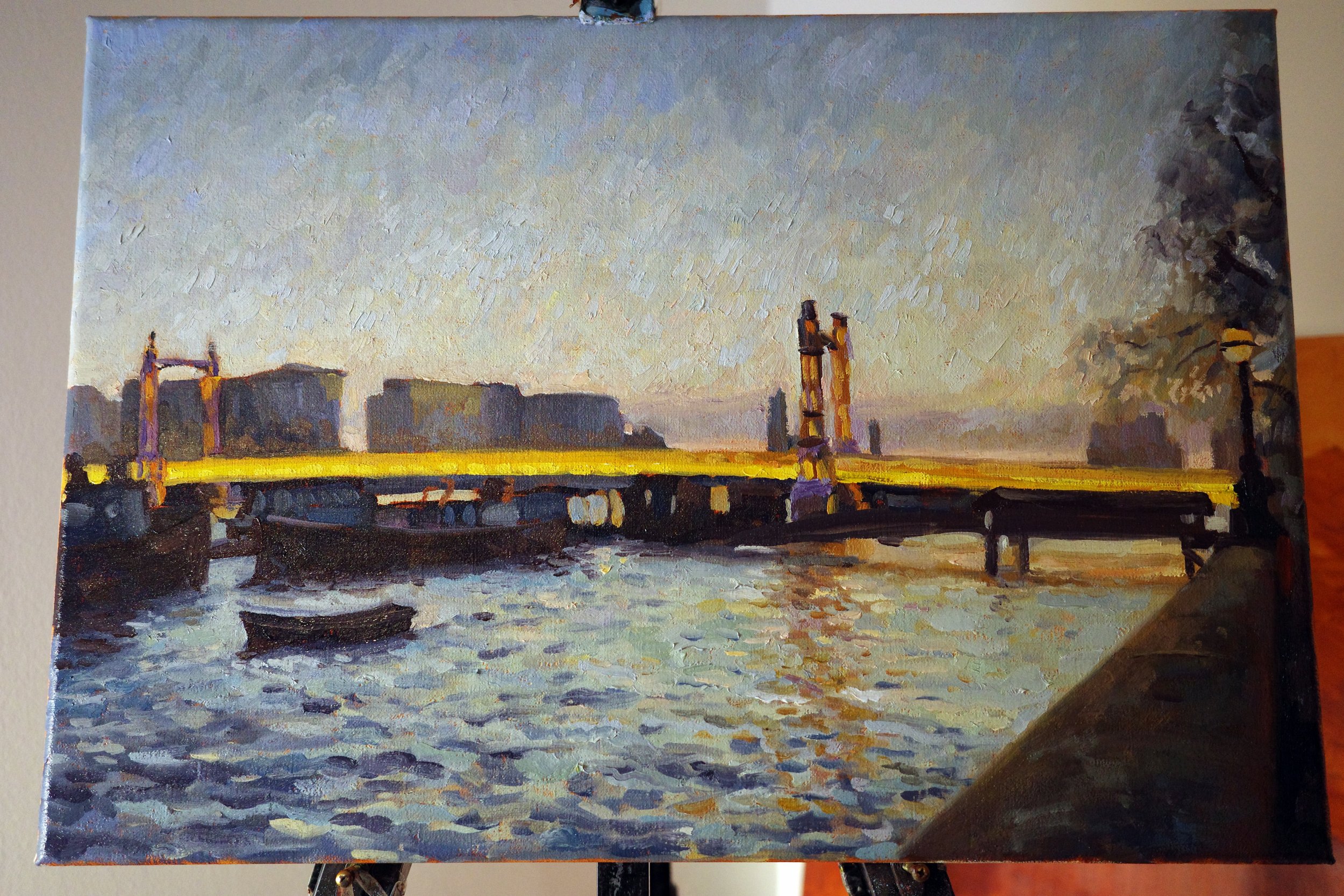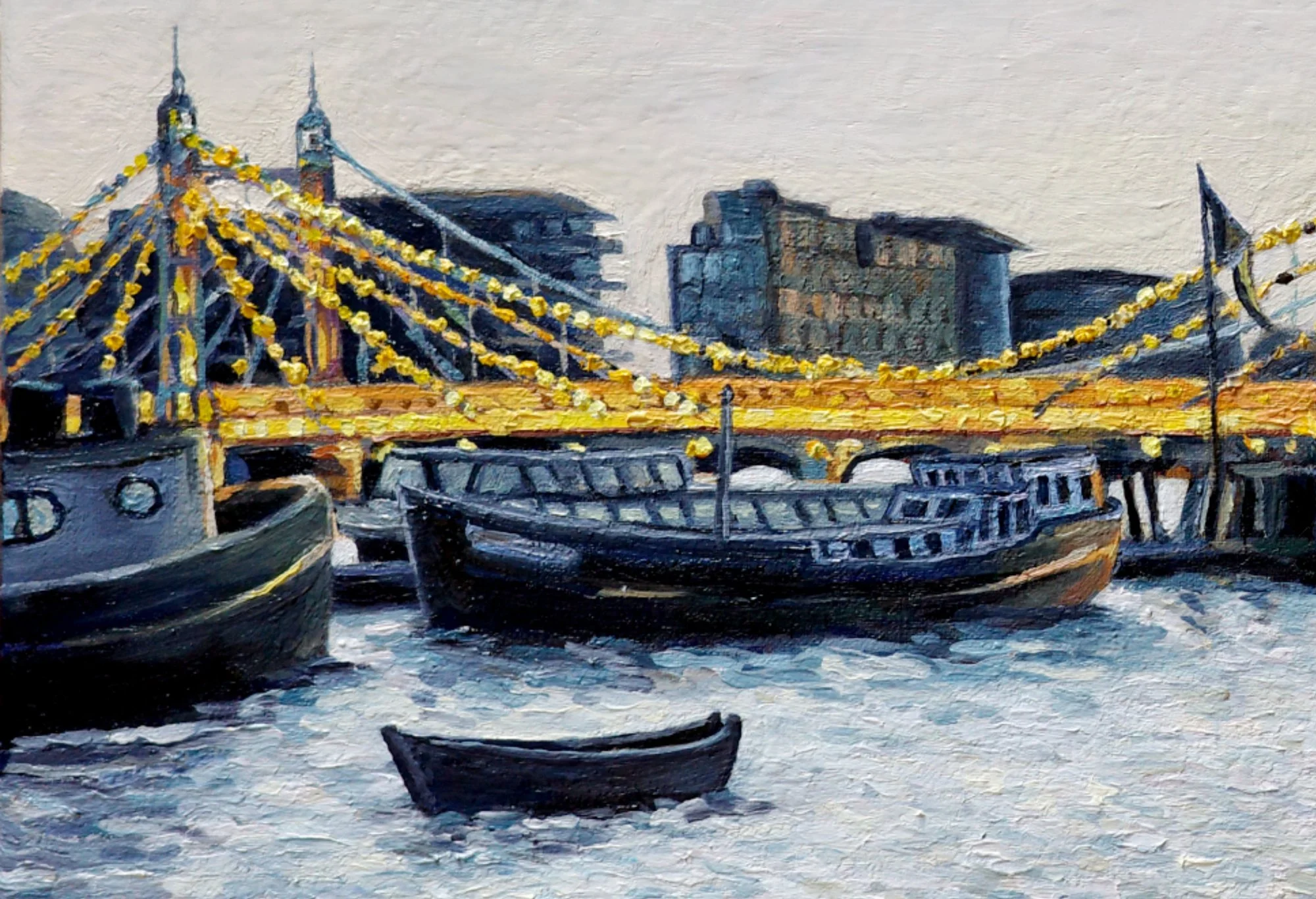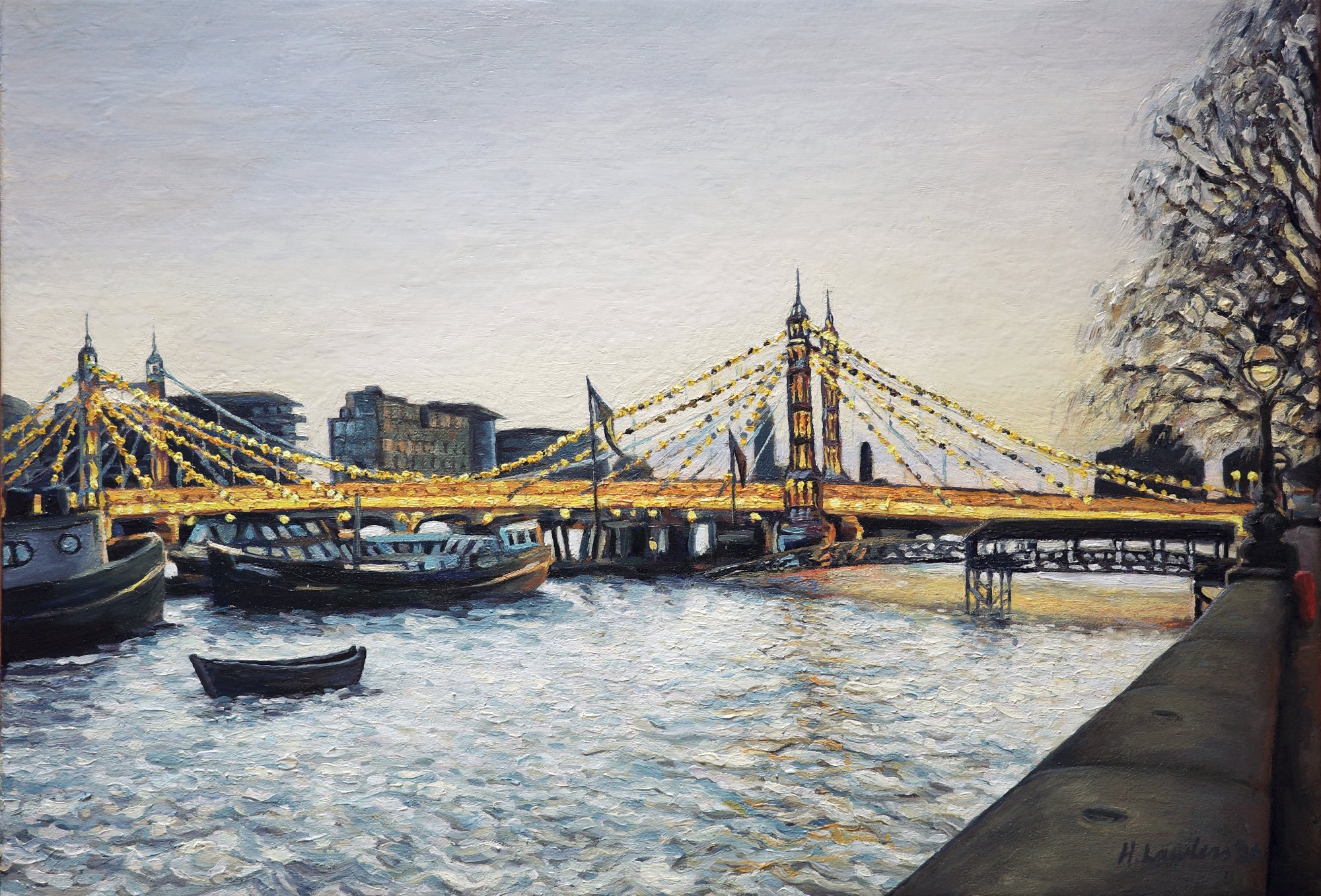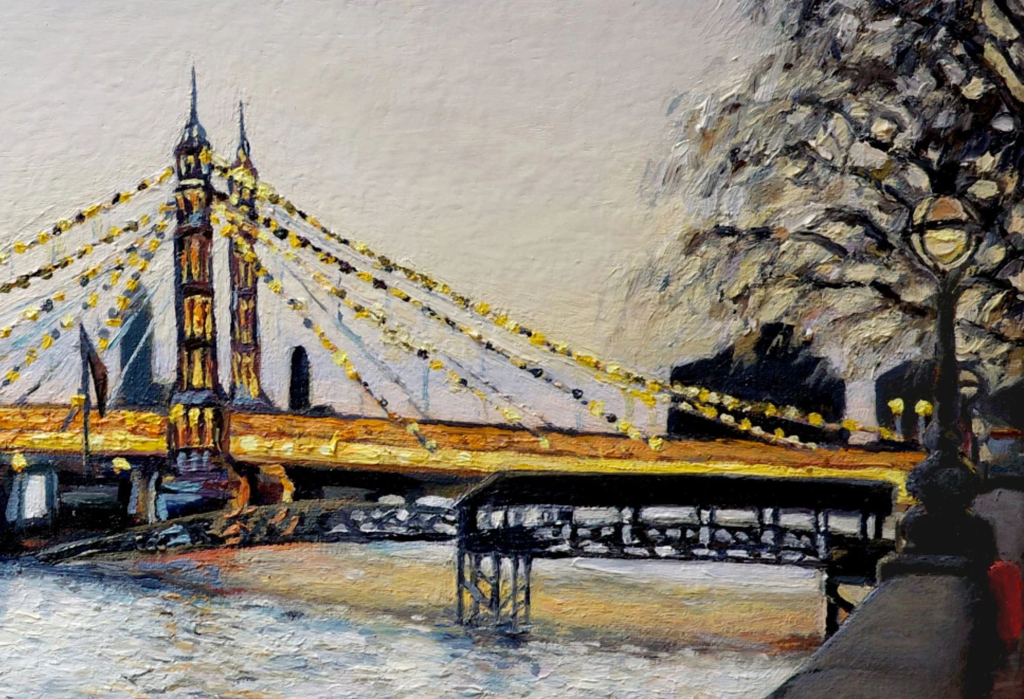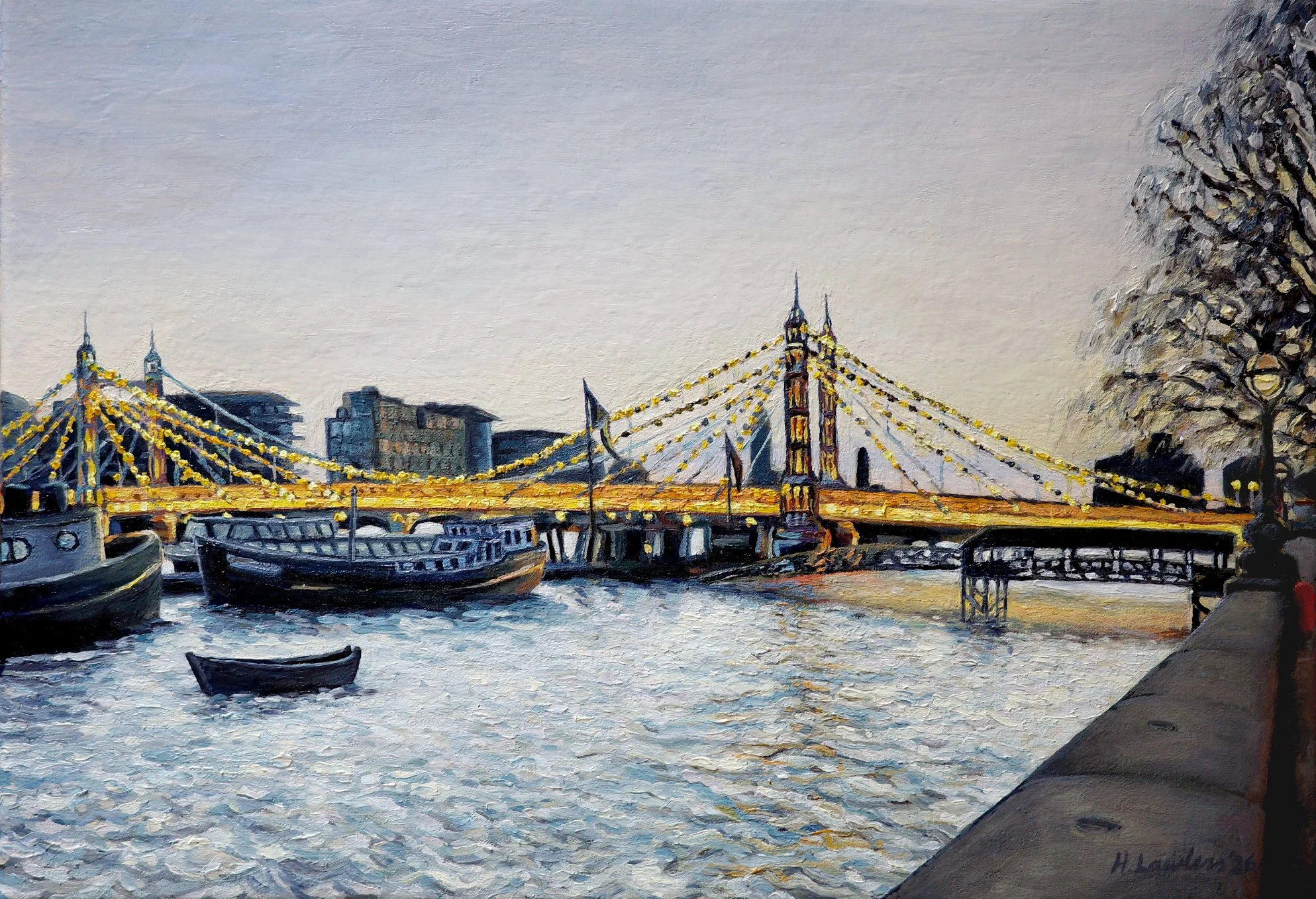 My client commissioned me to paint Albert Bridge at dusk to commemorate her time living in London, as she prepared to move back to Spain. She wanted to capture the lights of the bridge against the grey evening, with the river, its boats and the classic street lights. She was inspired by a painting I did a few years ago of the same scene, which we used as a starting point.