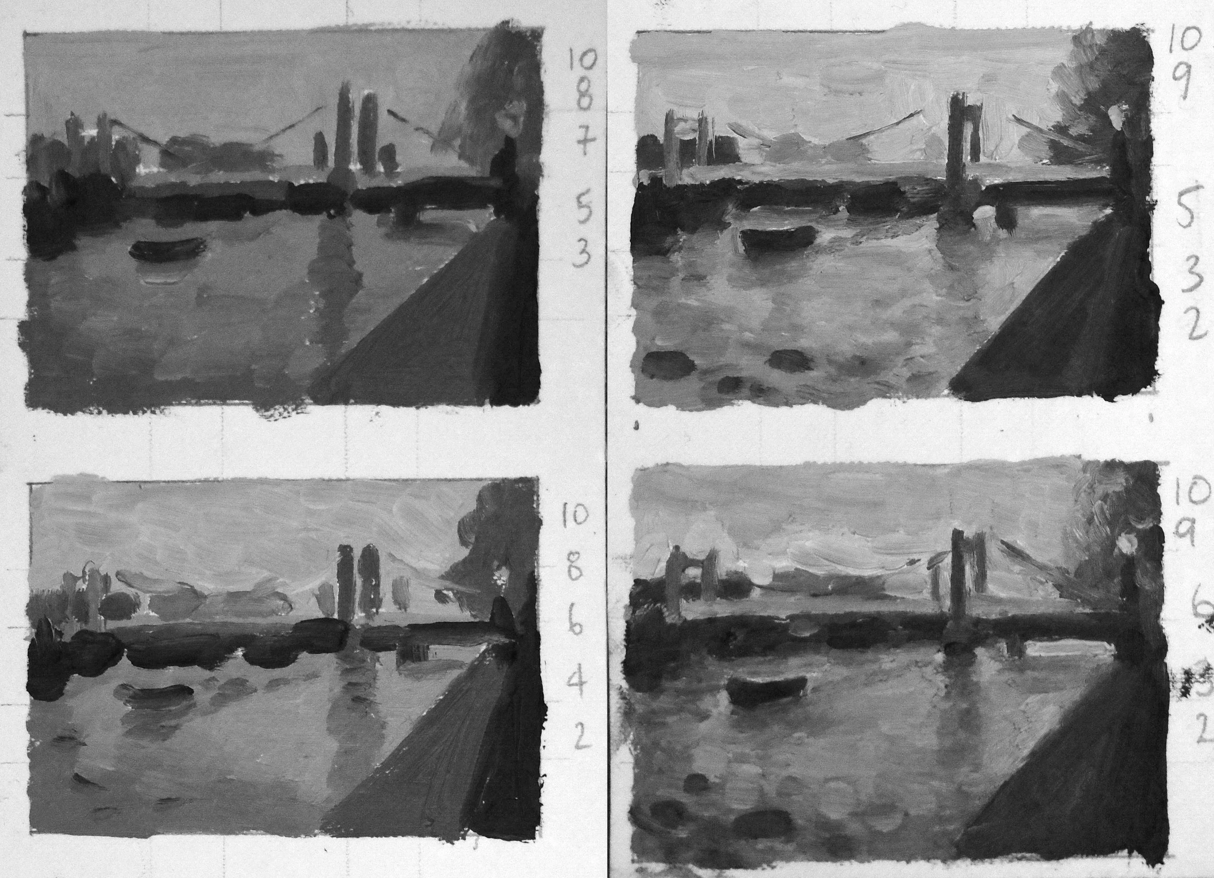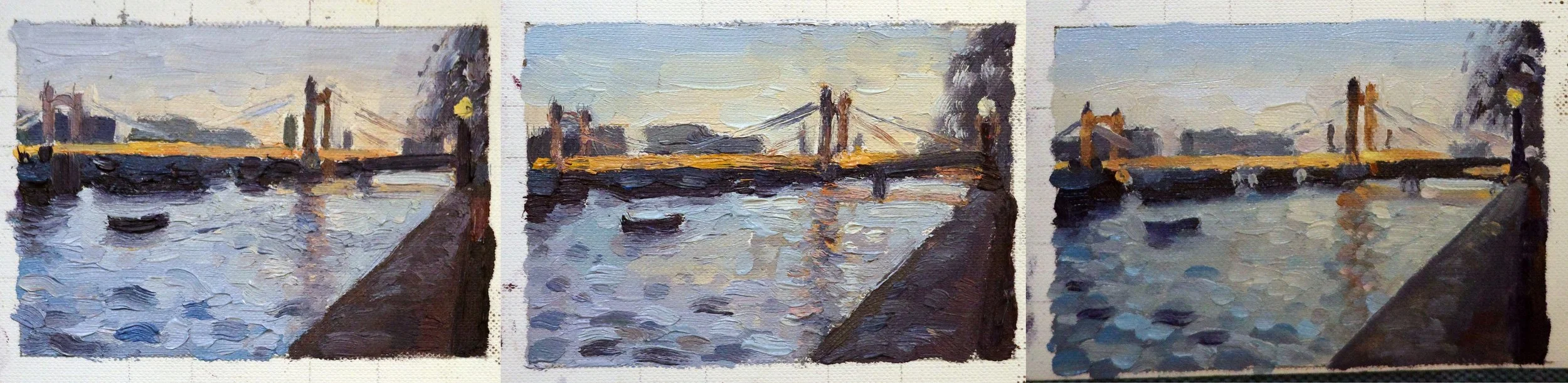 To change the colouring from cool blue-green to silver-grey, I mixed pink and purple-greys and painted them into the sky and water. I darkened and sharpened the edges of the tree, background buildings and boats so that they became a stronger silhouette. I reduced the contrast in the dark platform and thinned its legs, so it didn’t visually dominate in front of the bridge.