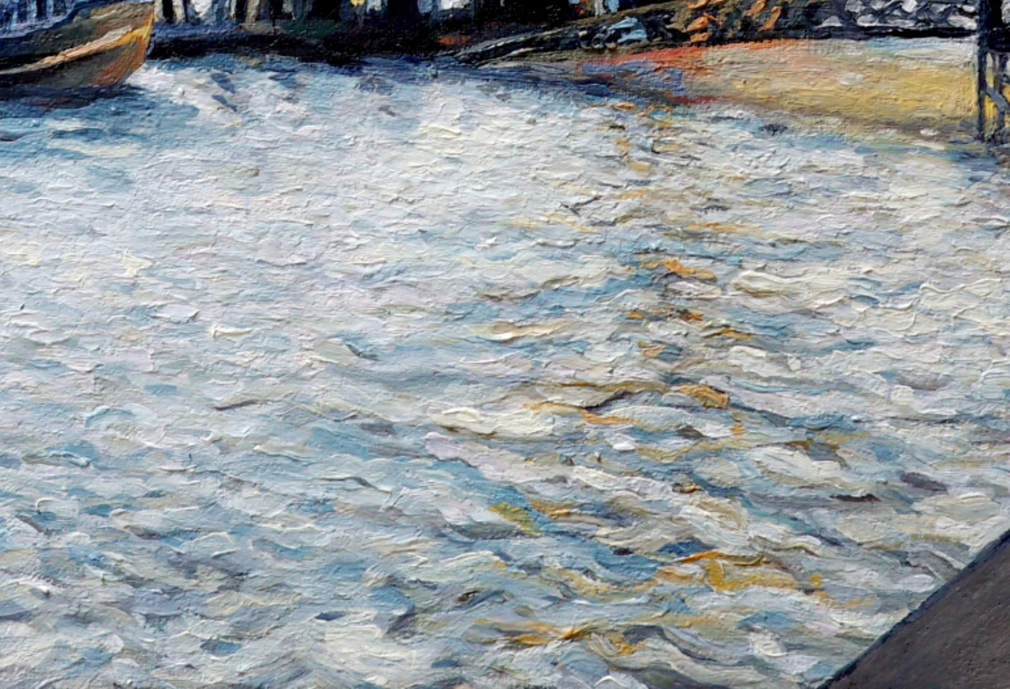 Here you can see the texture in the water. It is built up with many, many layers of different colours, so you cannot distinguish each brush stroke, but the colours shimmer through the final silvery layer.