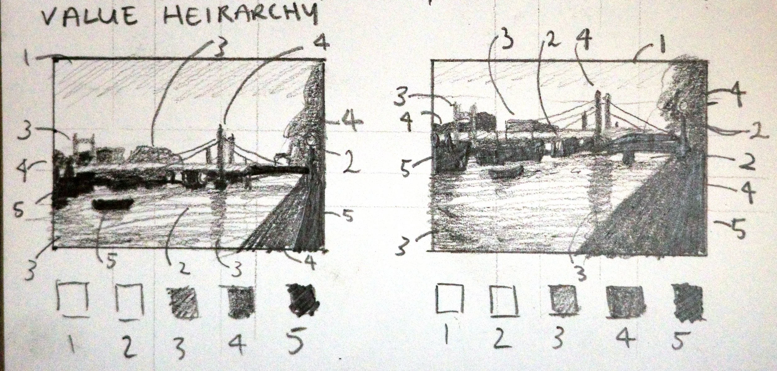 Next, I focused on value, working out the hierarchy of lights and darks through small studies.