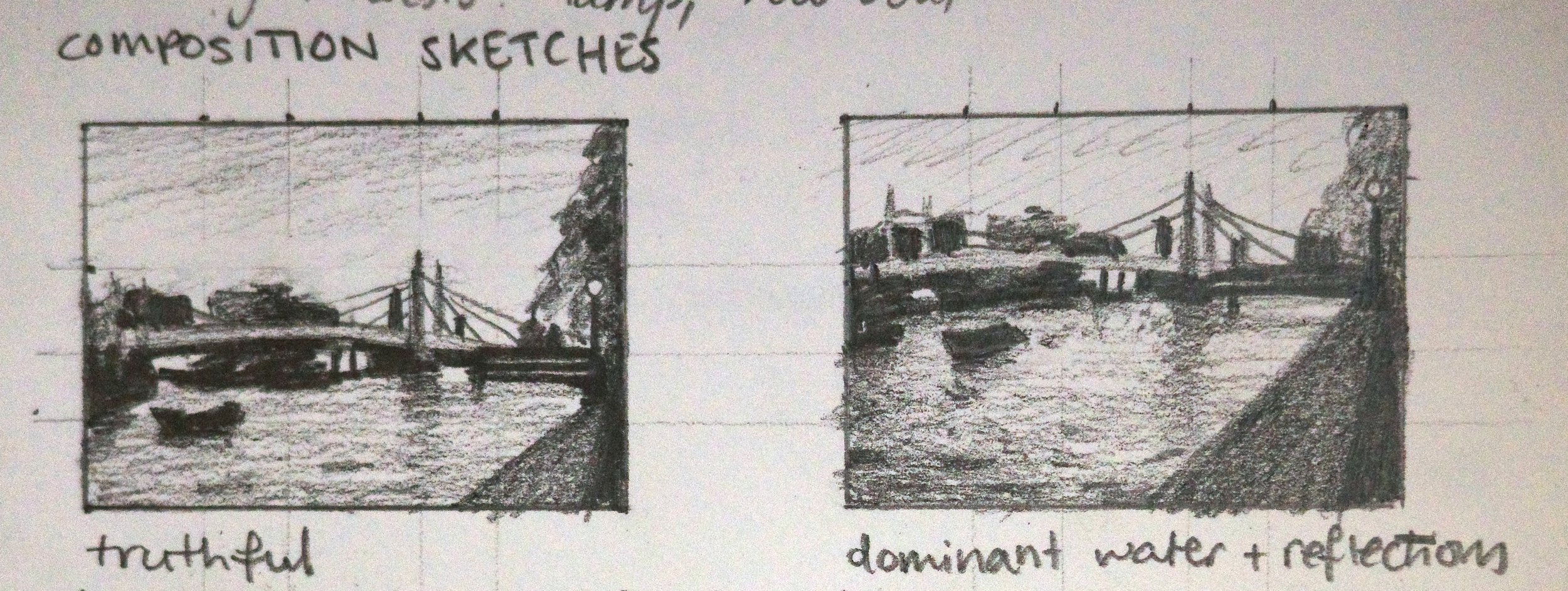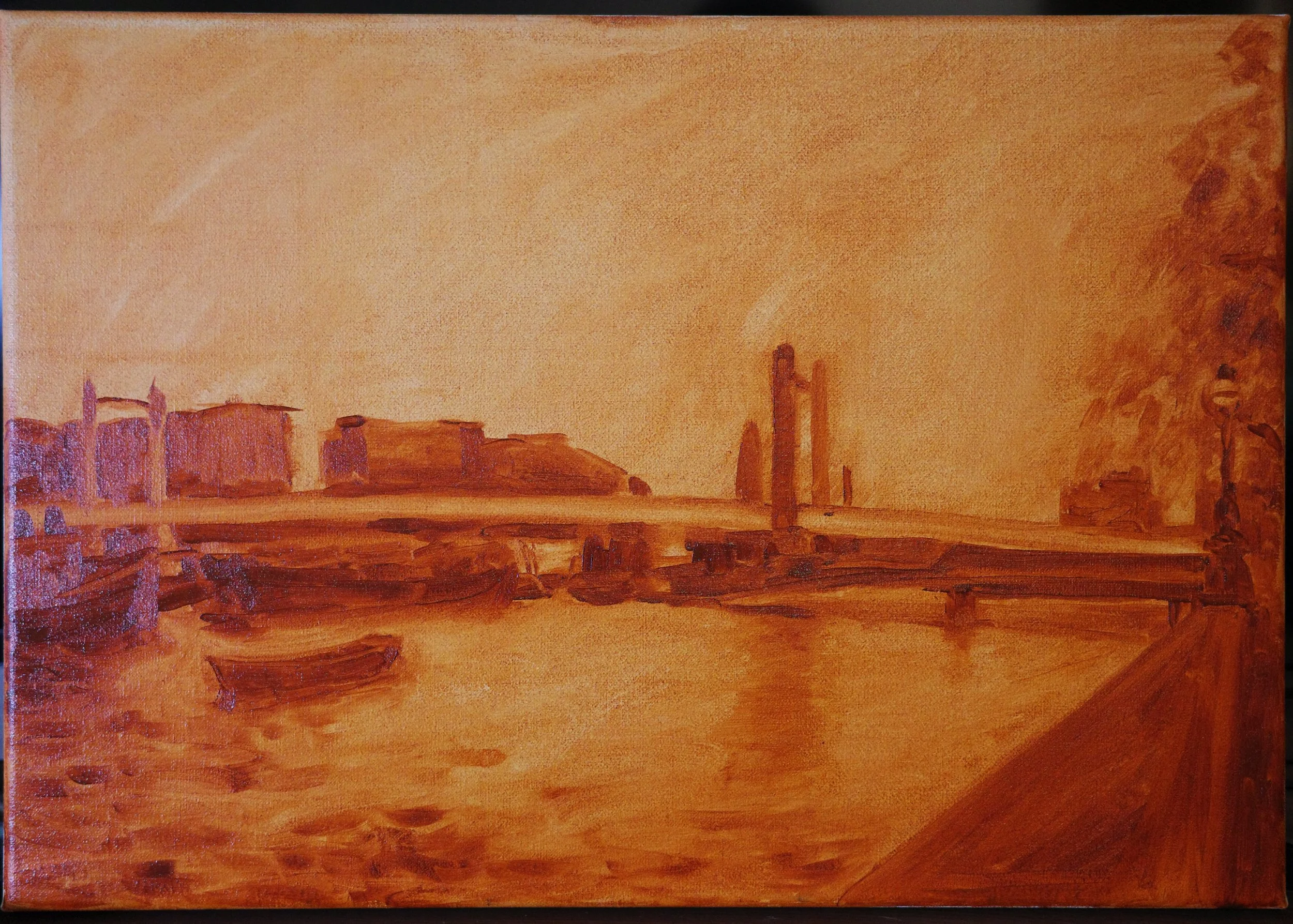I sharpened the edges of the tree, buildings and boats, but not to a level that made them silhouetted against the sky. I ended up taking this further for the final painting.