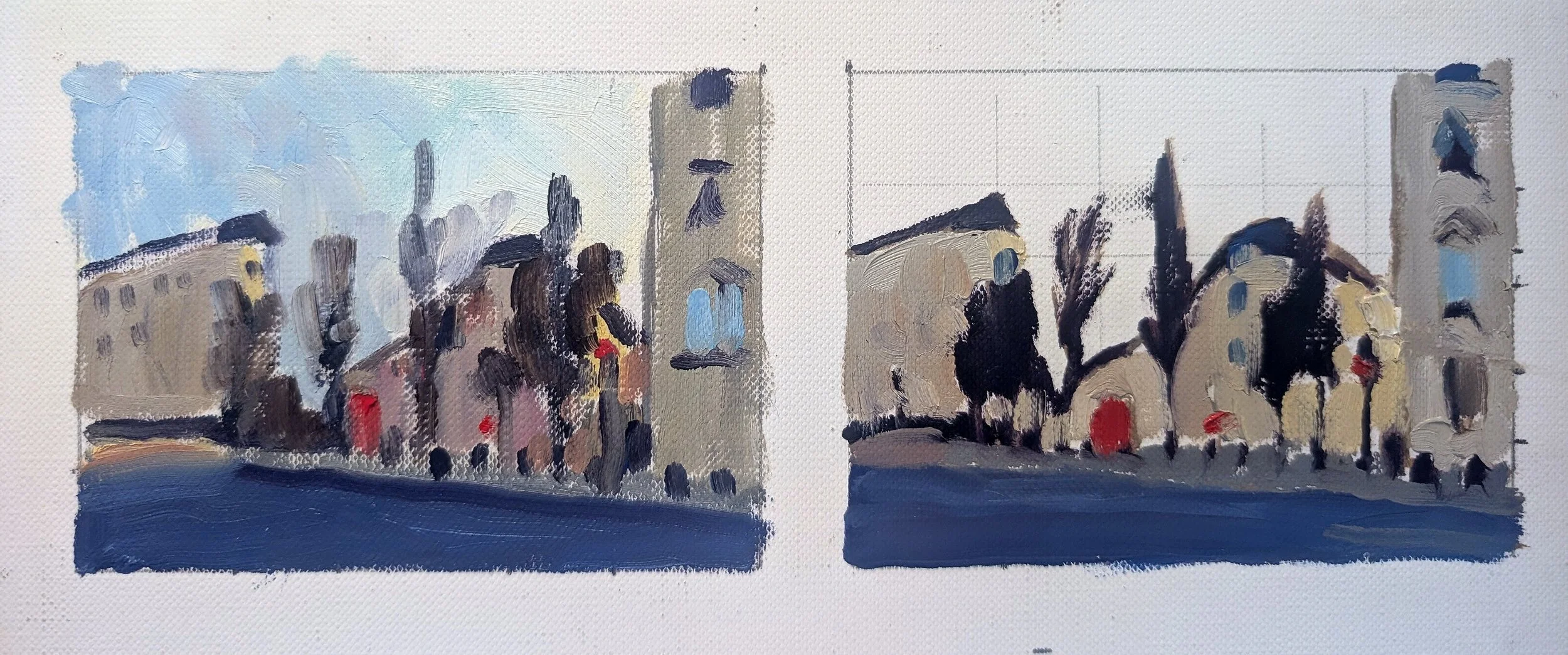 I then painted these two little sketches to experiment with colour choices. The buildings are white, but this appears as green, blue and orange in the shadows and bright yellow in the light.