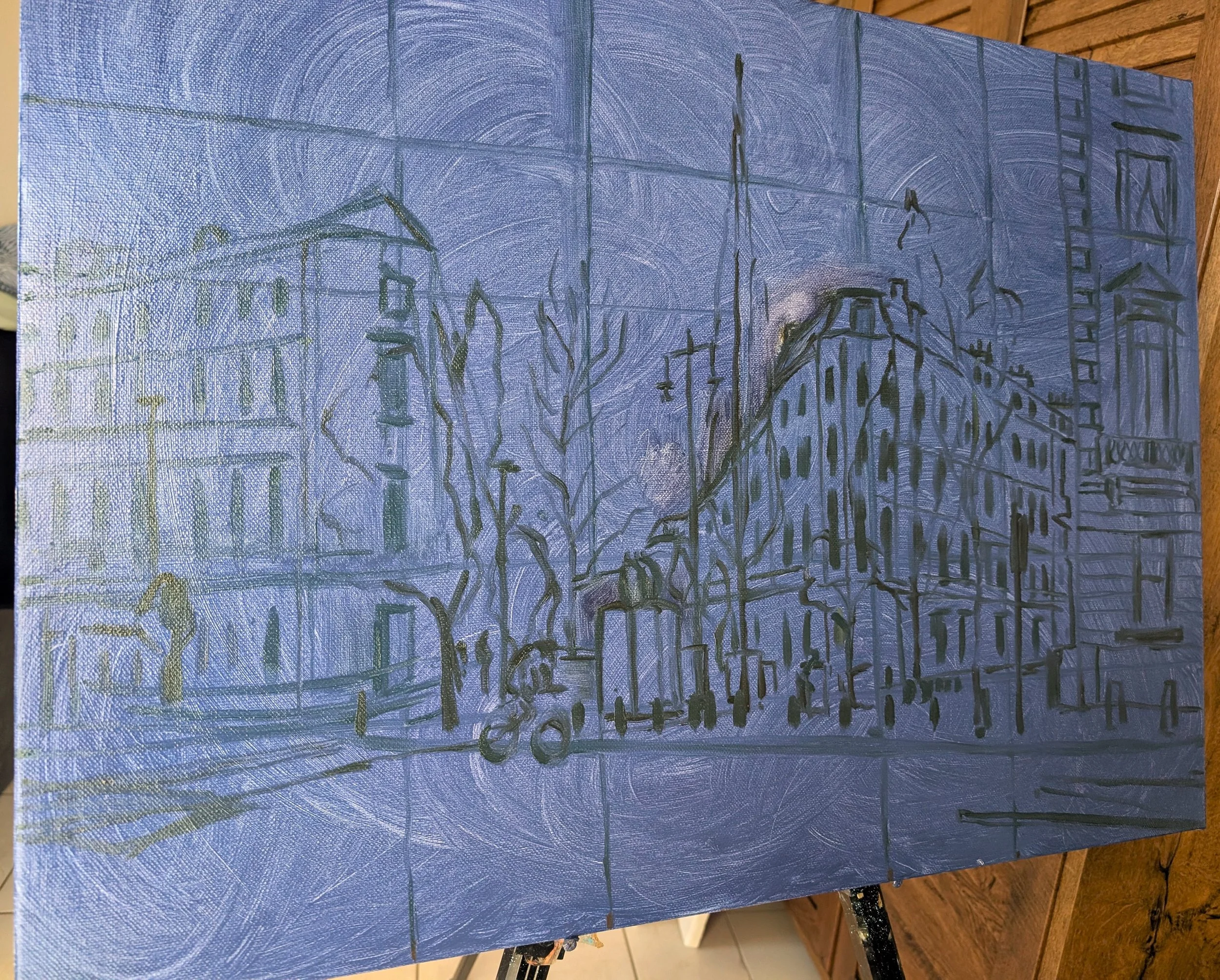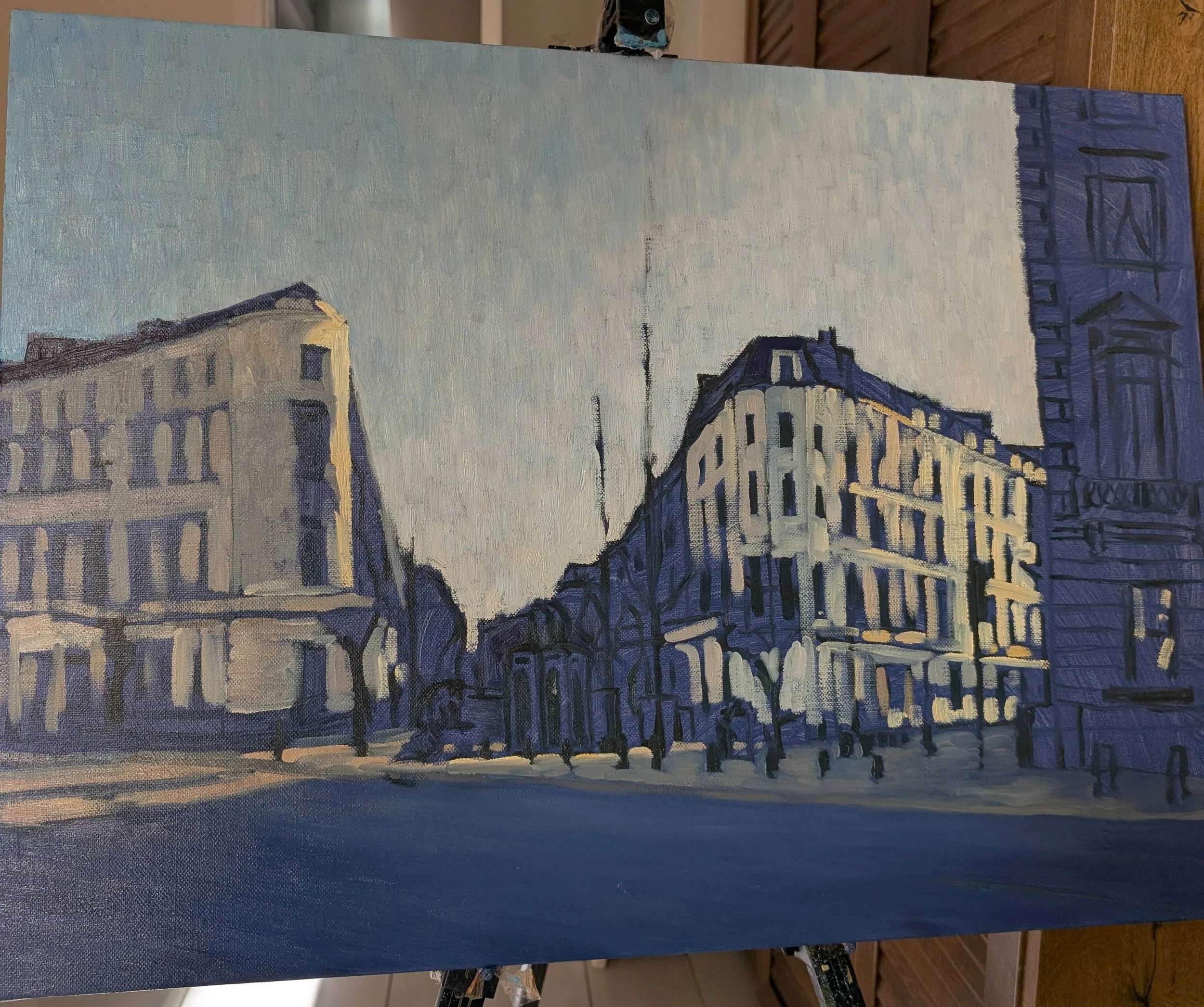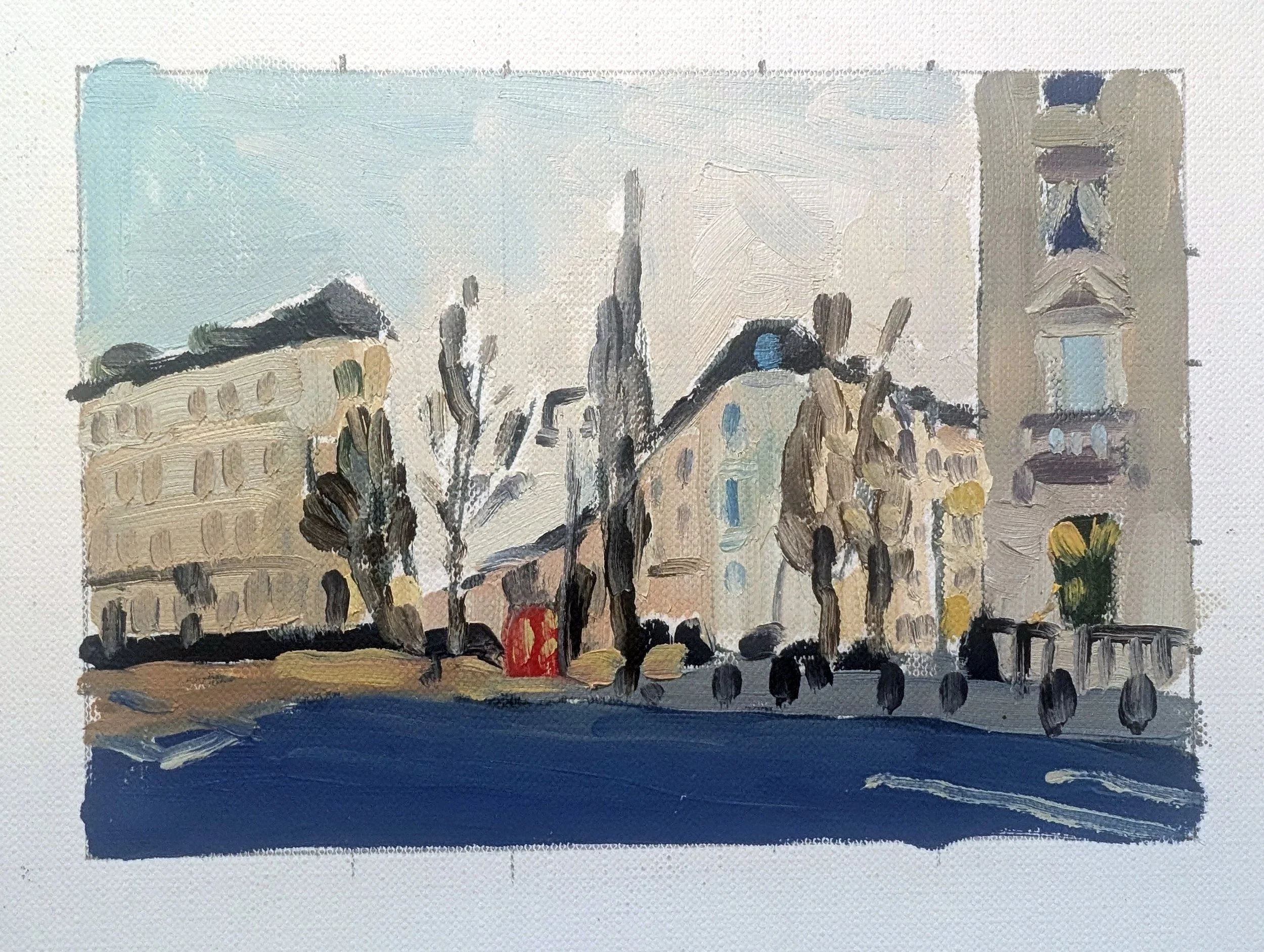I started by painting the lightest lights - the sky and highlights on the buildings, and the darkest darks- the roofs, tree trunks and bike racks. From here I can judge the value of my colours between these two reference points.
