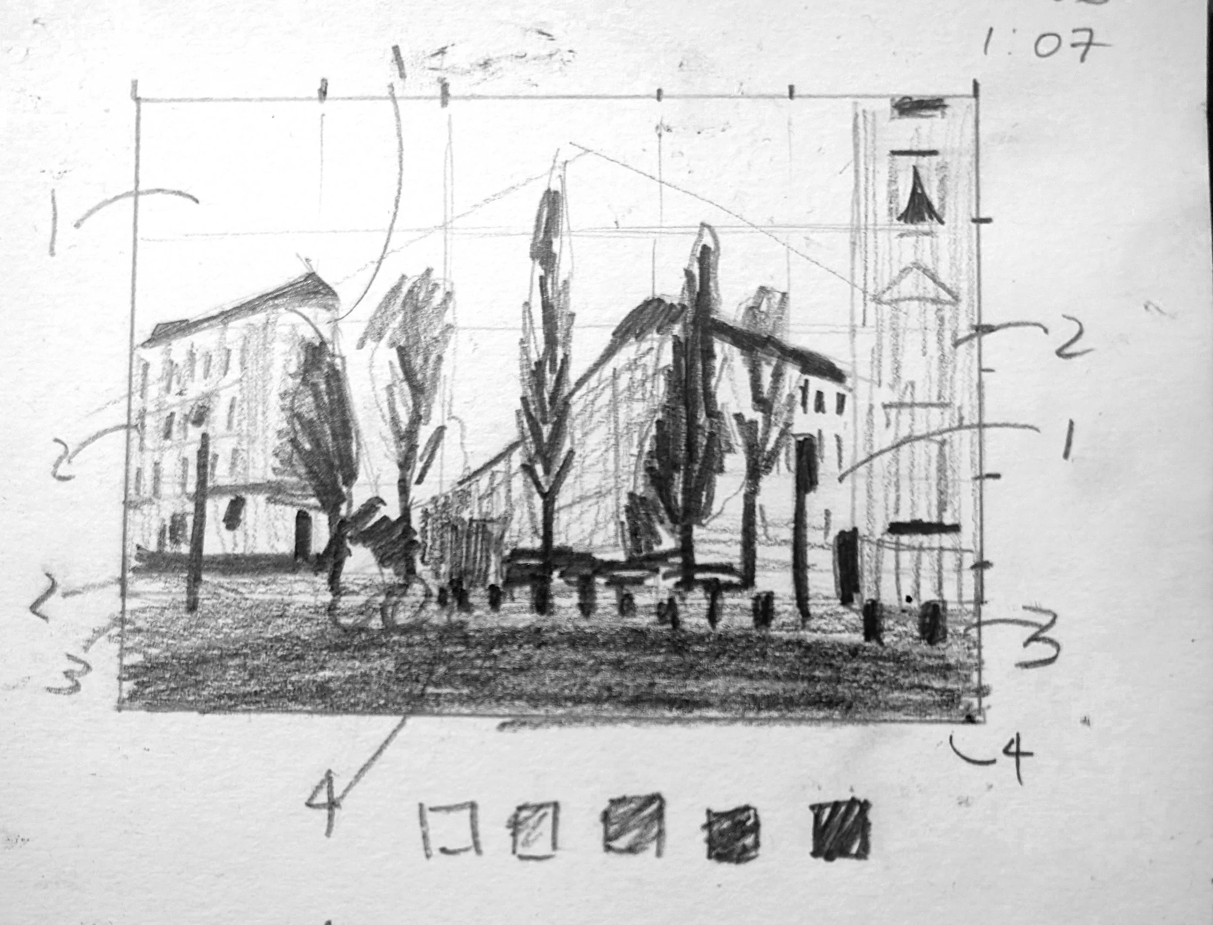 I started with a rough little sketch of the scene, mapping out the lights and darks.