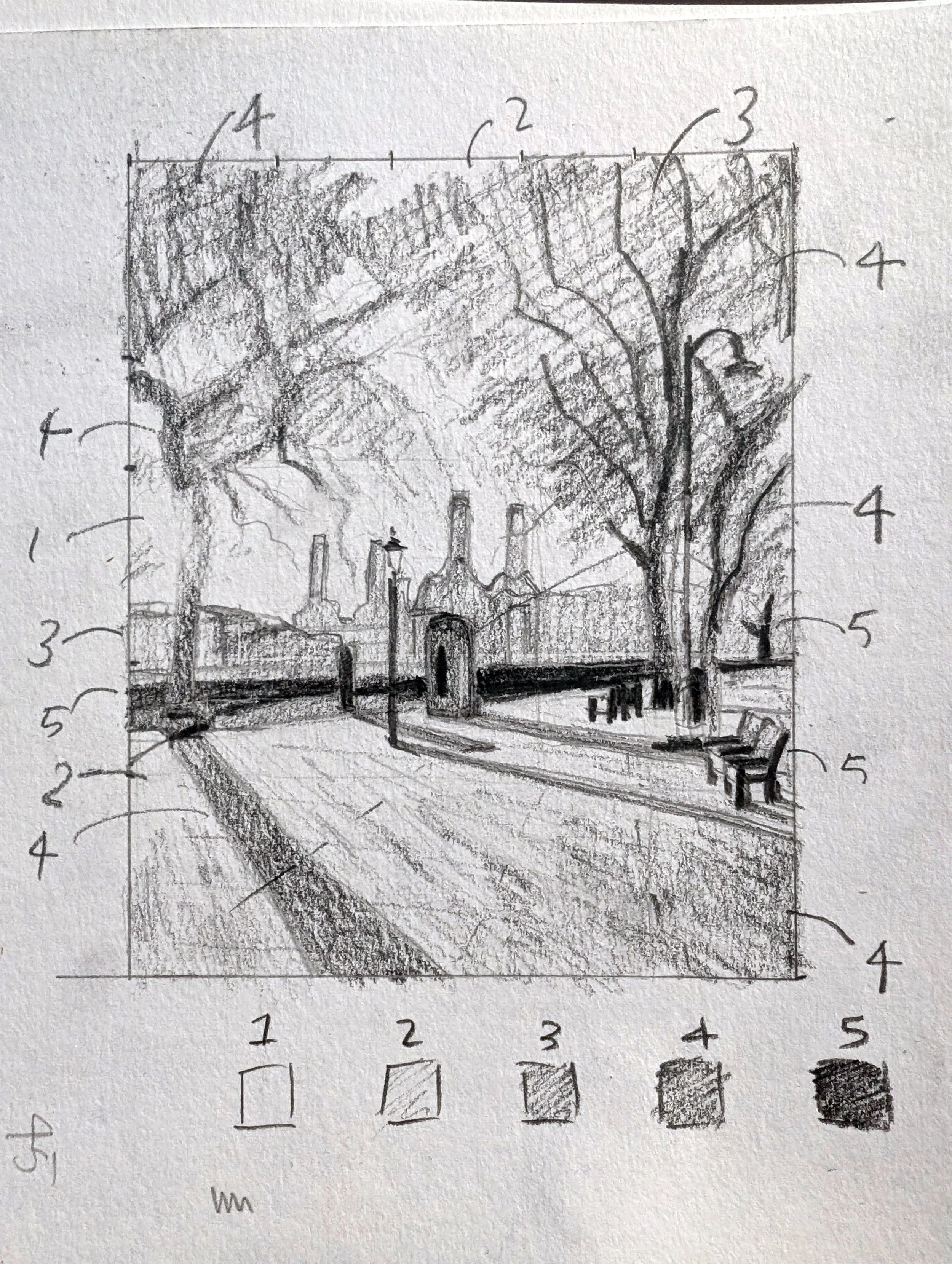 I started with this sketch to work out where the darks and lights fell in the scene. This is important to make the lighting and shadows feel real.