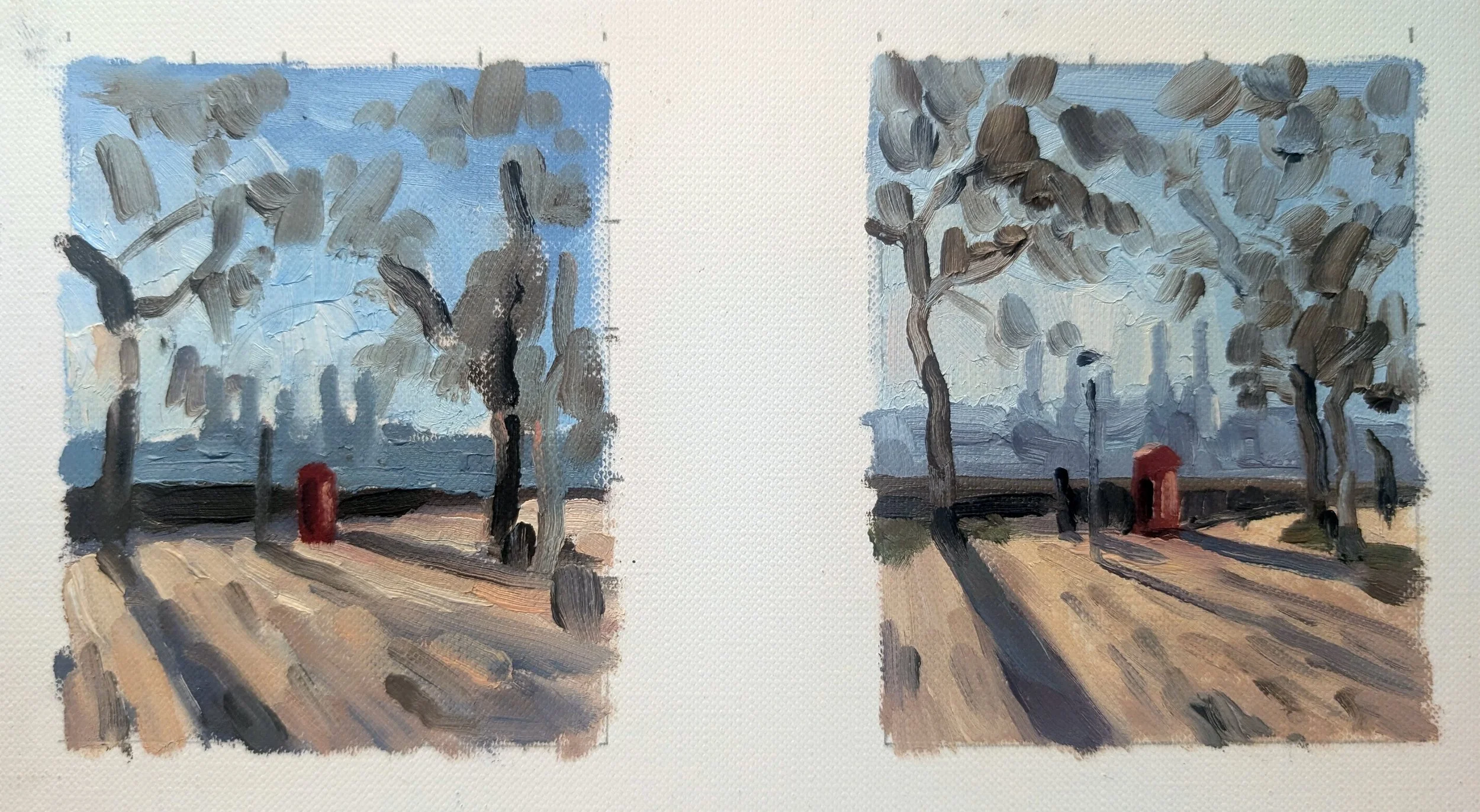 These little paint sketches helped me to explore the colour. The blues in the first painting are warmer, which I corrected in the second for the wintery light.