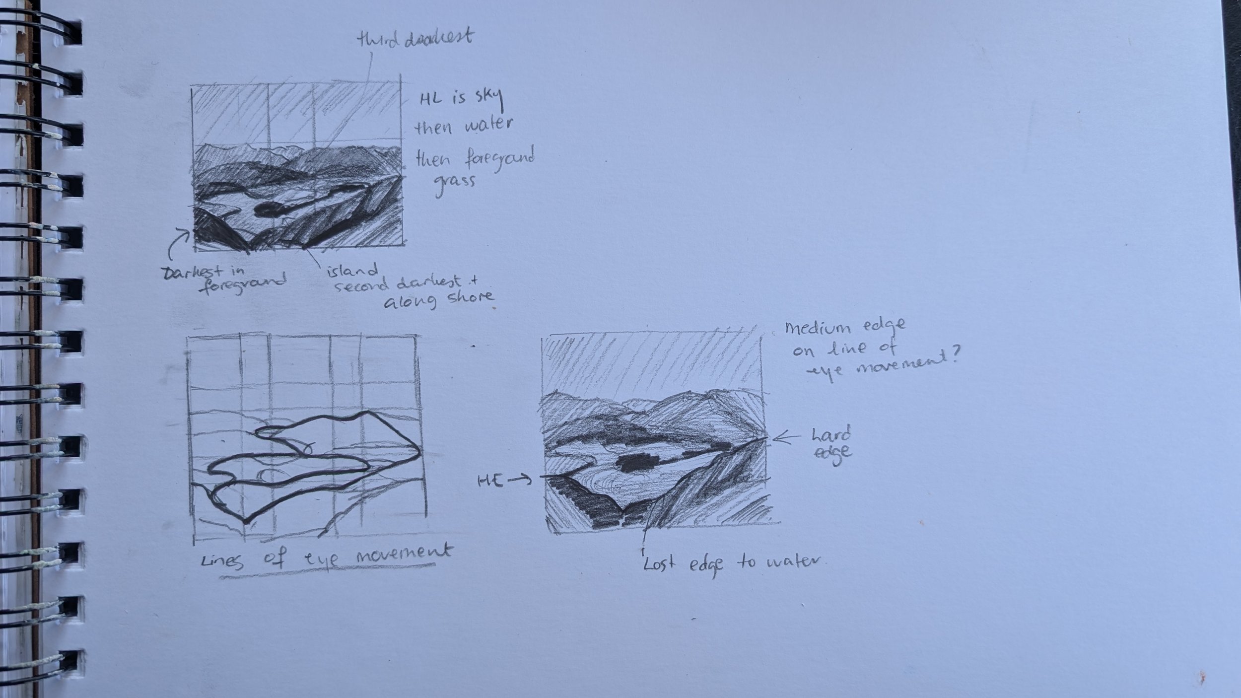 I started with tiny thumbnail sketches working out the composition, edges and values.
