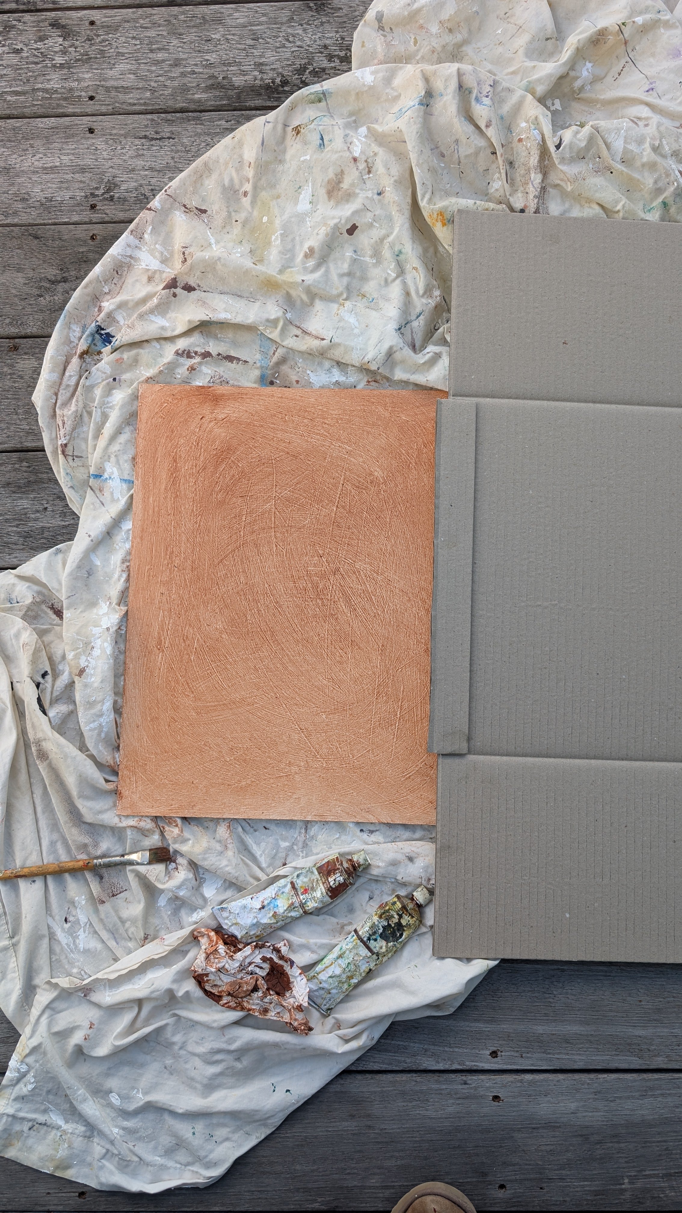 I applied 3 coats of gesso and then toned the board with a mid-tone orange undercoat. In this photo I’m checking the value against the mid-tone of a cardboard box. Working from a middle value helps me better judge lights and darks in the painting.