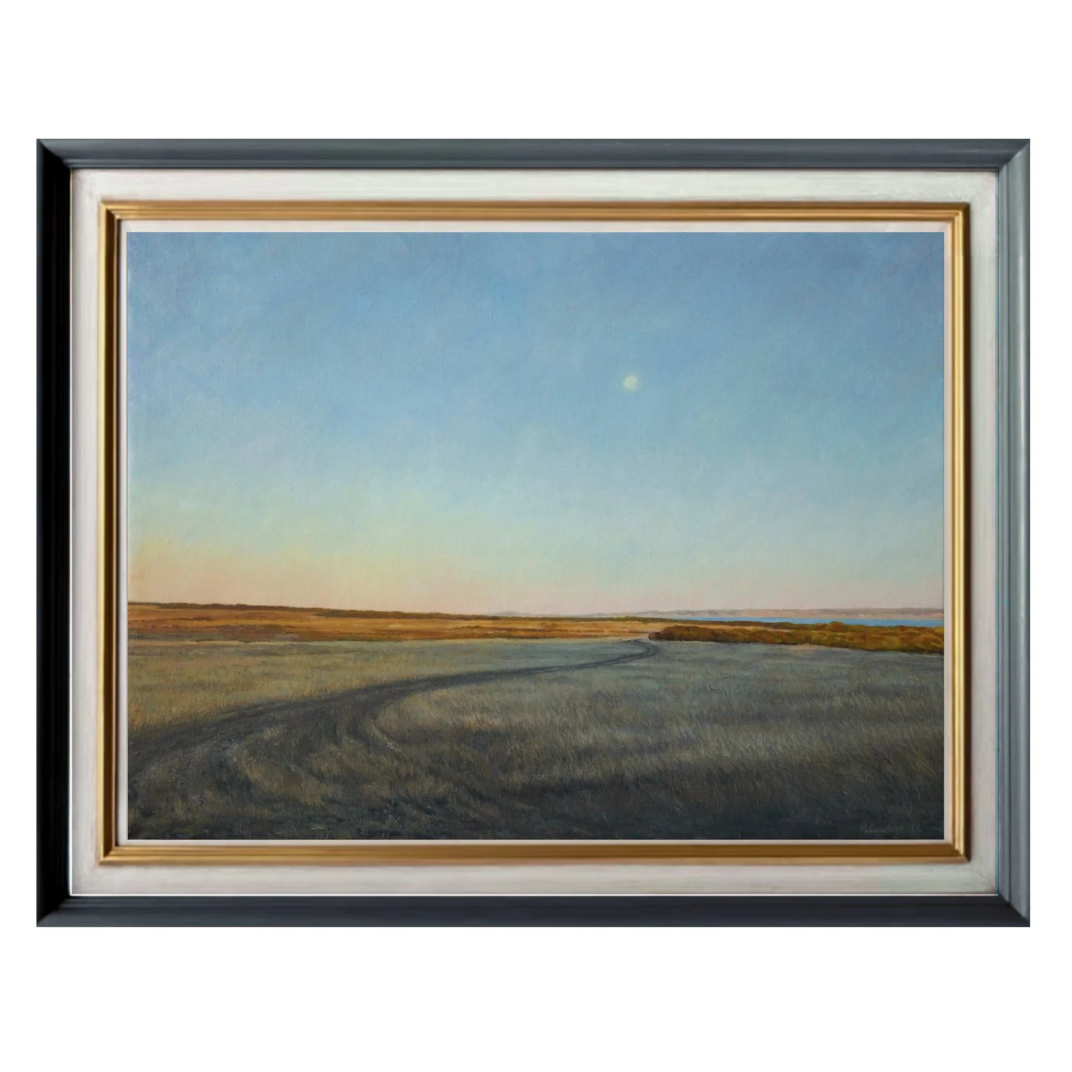 The Eyre Peninsula in South Australia has such a wild, isolated beauty. I was staying on a farm right at its tip, where it felt like we were the only people in the world. I went for a walk to look for emus at dusk as the moon was rising. The way the final rays of sun made the distant paddocks golden orange was so striking under the grey-blue sky. The sliver of The Bight that I could see in the distance glowed a surreal blue. I knew I wanted to capture this moment in paint.