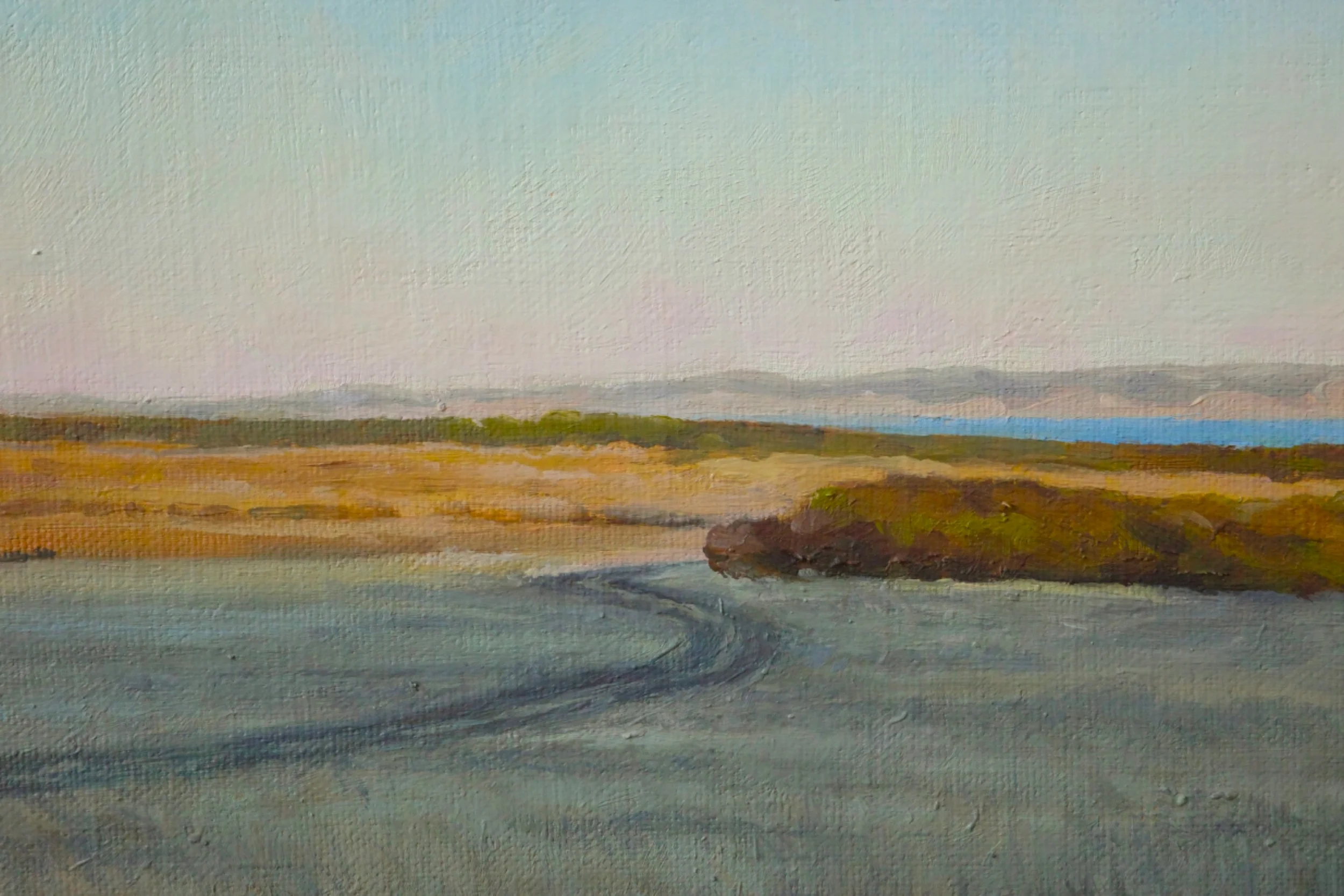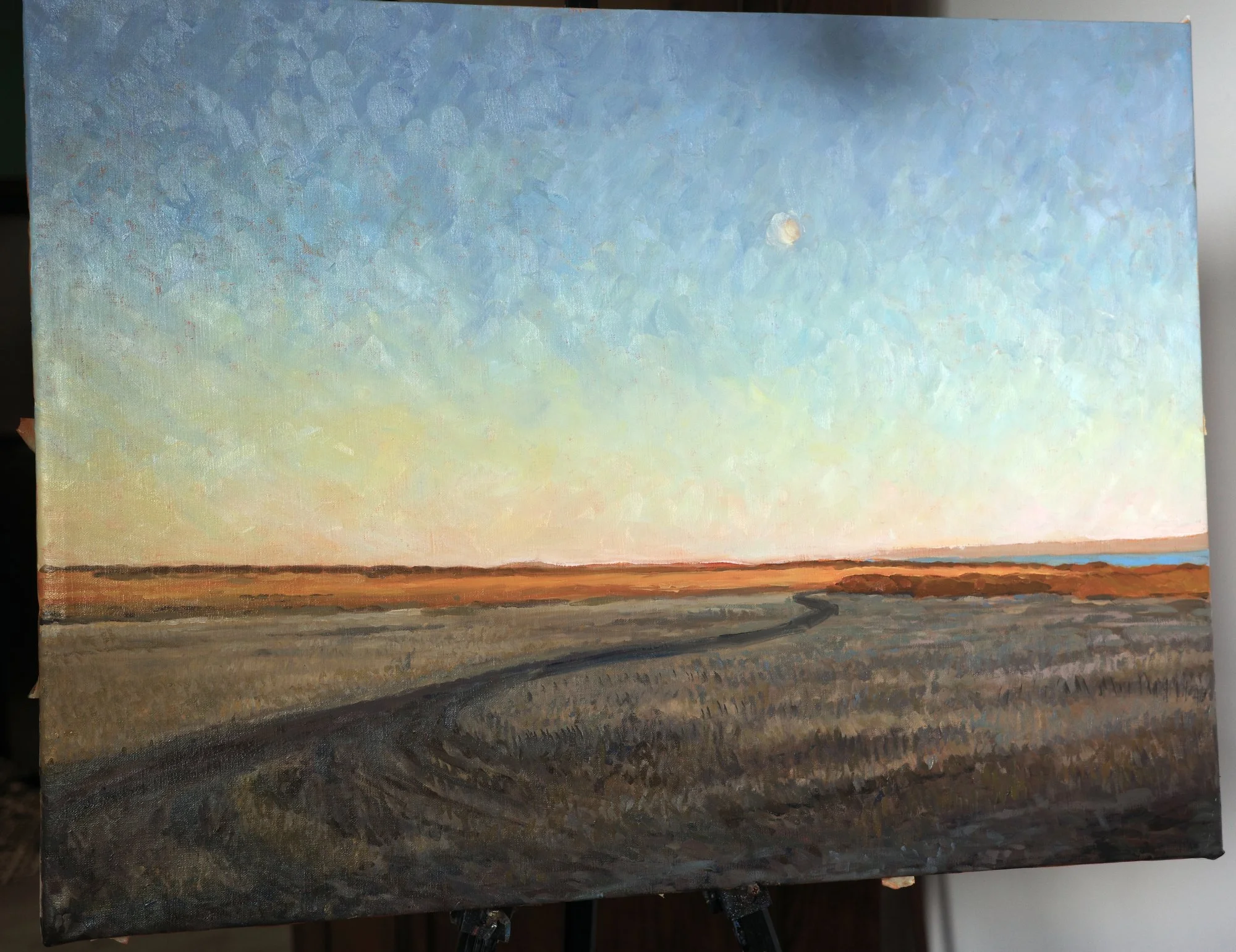 I wasn’t sure how to treat texture in this painting. At first, I went with a textured, interesting sky and softer grasses. But here is where I decided to swap this relationship. I started to soften the gradient in the sky and build up texture in the grass. This choice creates a feeling of stillness in the painting by getting rid of the busyness in the sky. Adding more variation in the grasses helps create depth, with the detail gradually dissolving as it recedes.