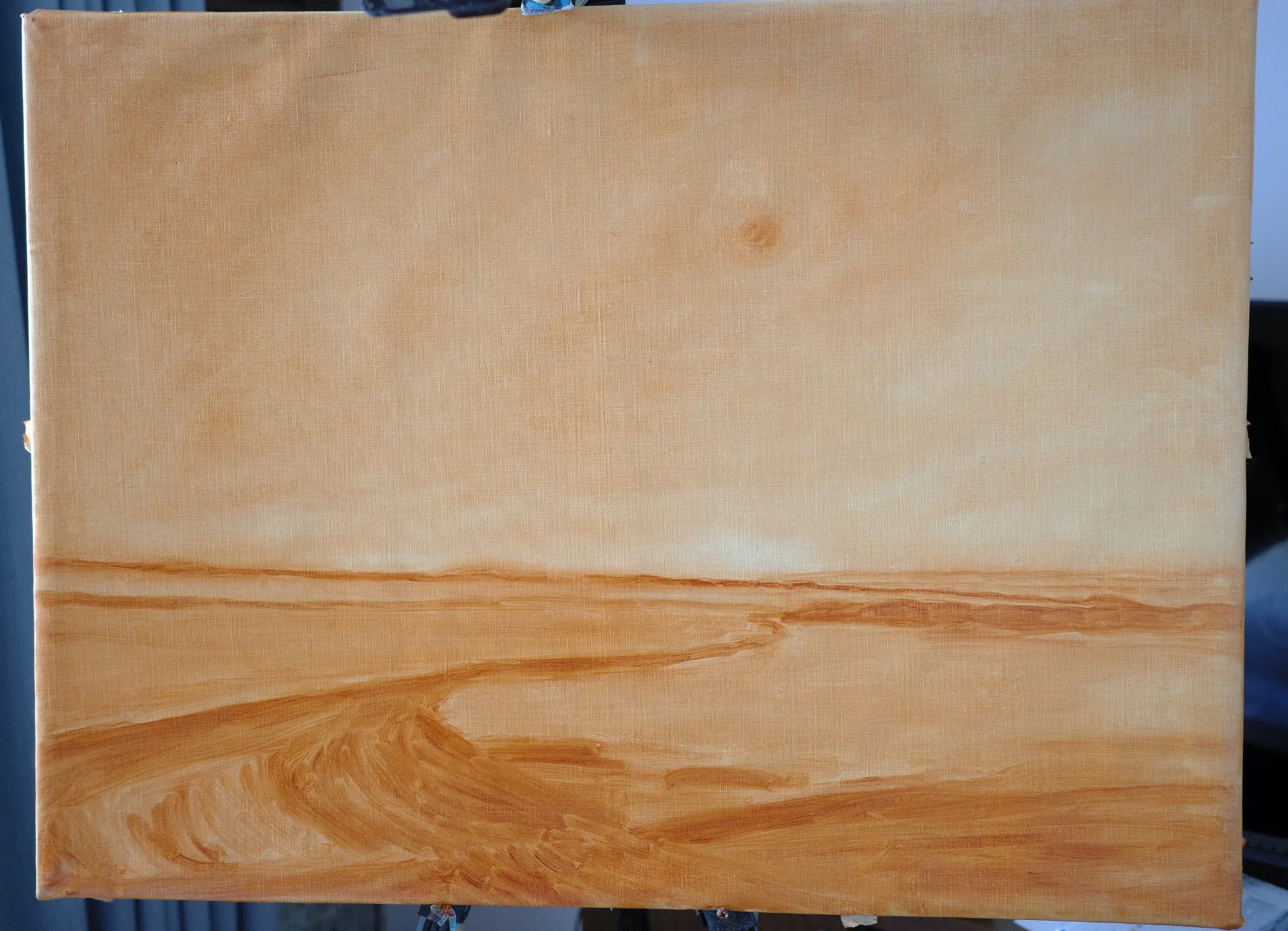 This was the start of the painting, where I placed the big shapes of the painting in using burnt sienna paint.