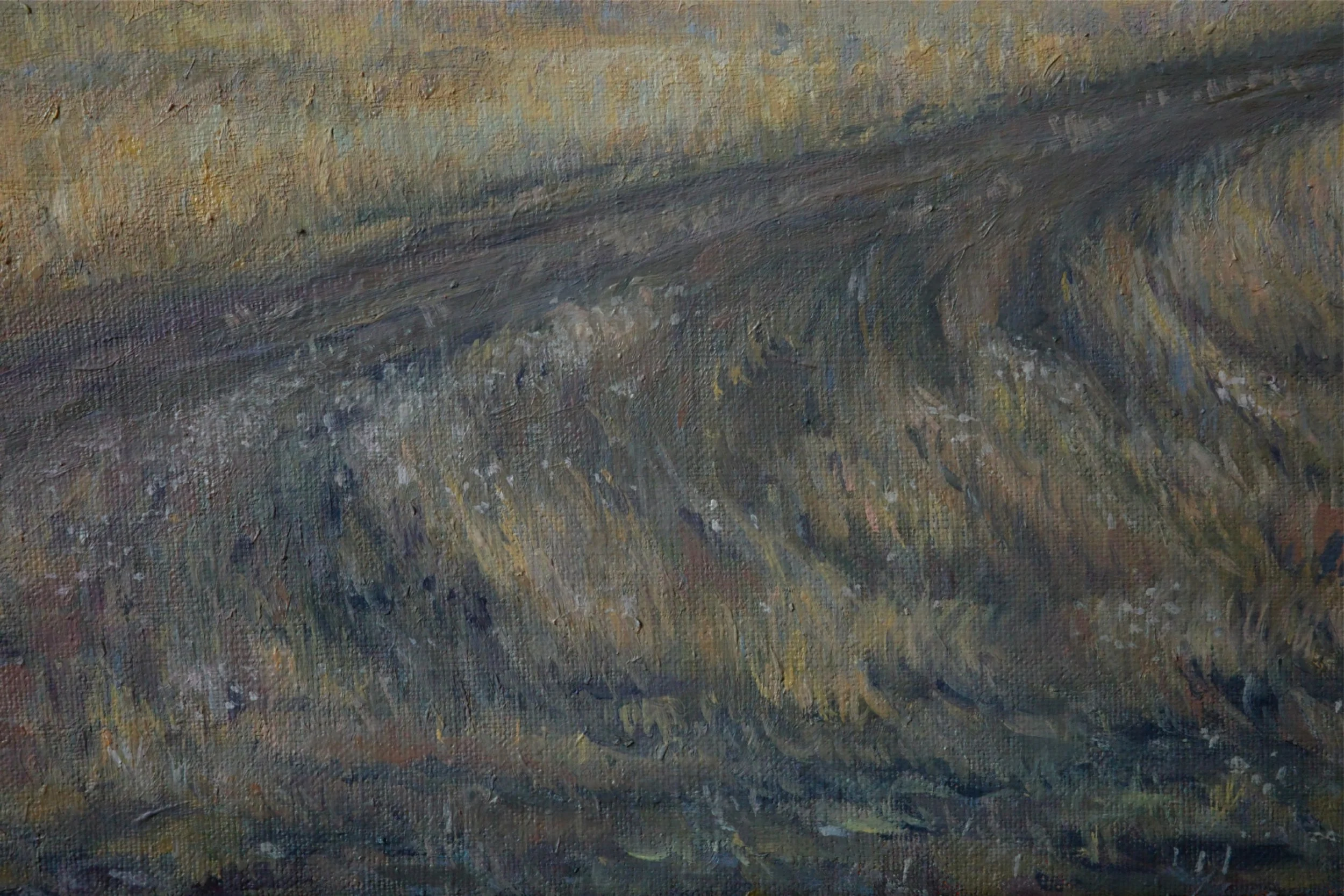 I enjoyed the slow process of layering the colours to create the grass texture. There’s so much hidden colour in a field that on first consideration just looks grey. The sunset colours in the grasses reveal themselves as you spend more time looking at this painting. It’s almost meditative.