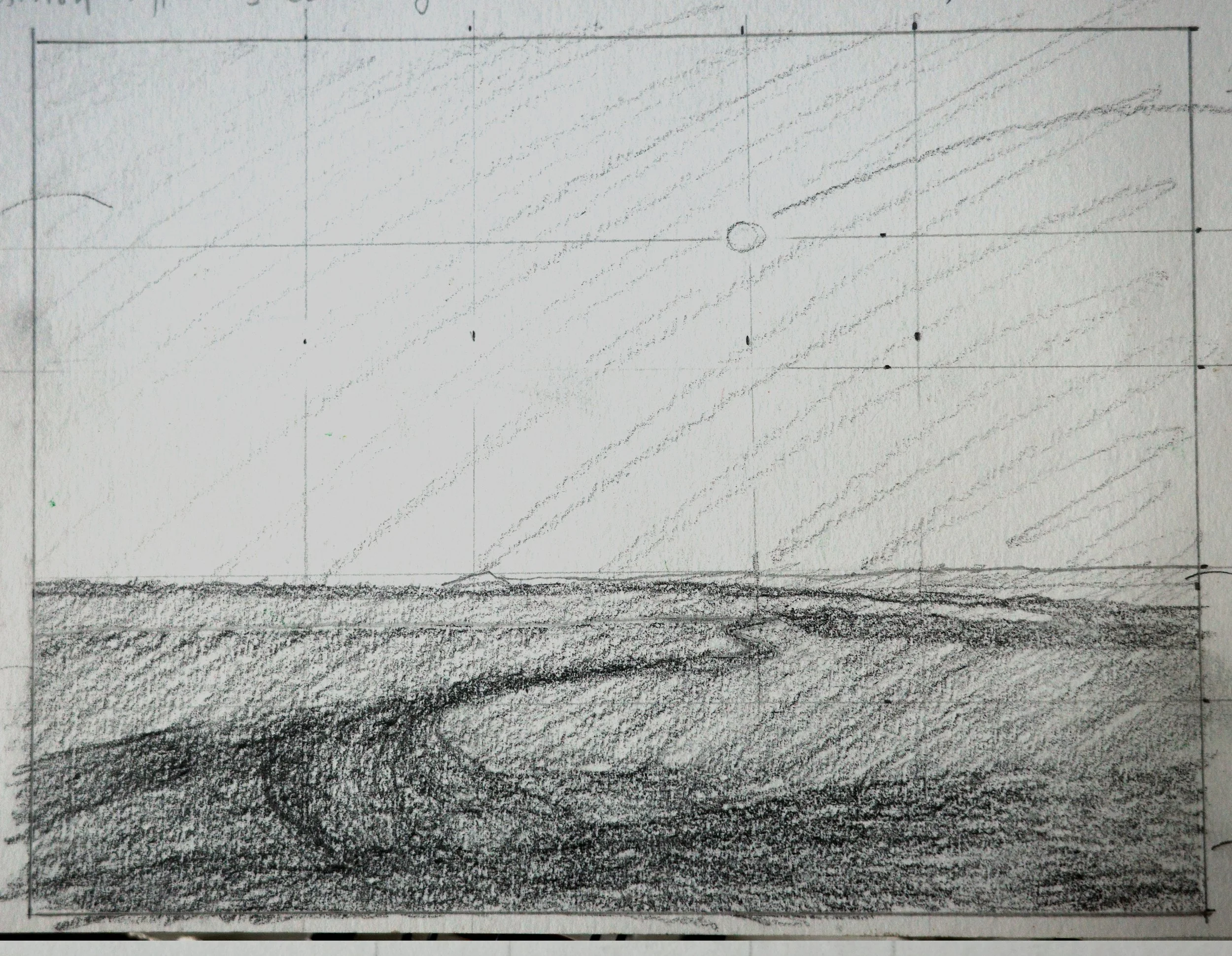 I started with a quick pencil sketch to work out the composition. I rearranged the moon to place it at the end of the track. The curve of the track pulls your eye in to the distance.
