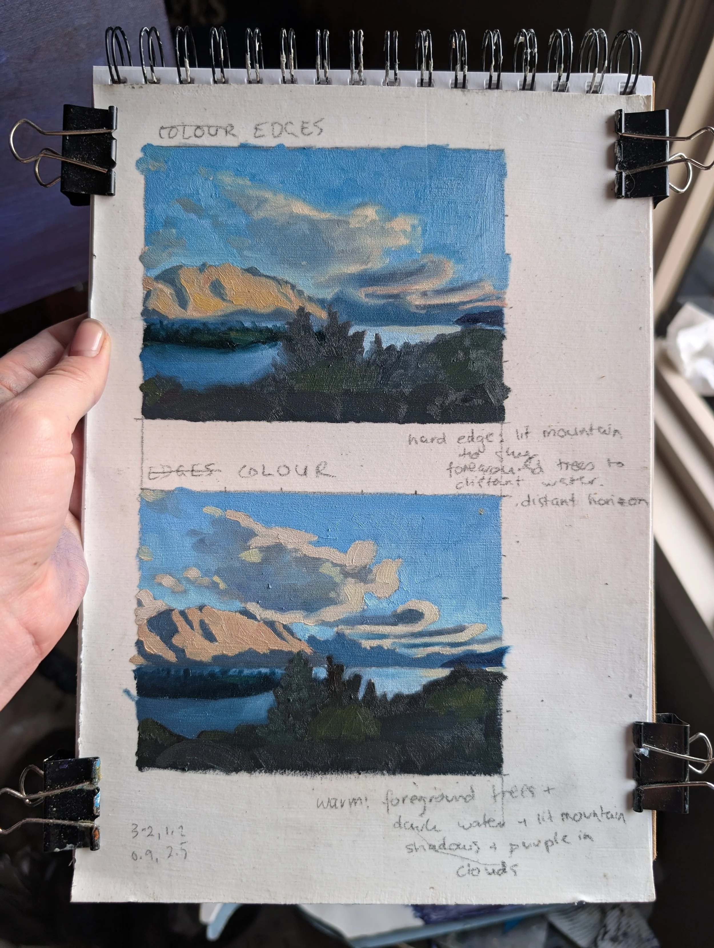 The top painting explores decisions on how the simplified shapes interact - with a soft, hard or lost edge. The hardest edge is on the top of the closest mountain as it’s my focal point.