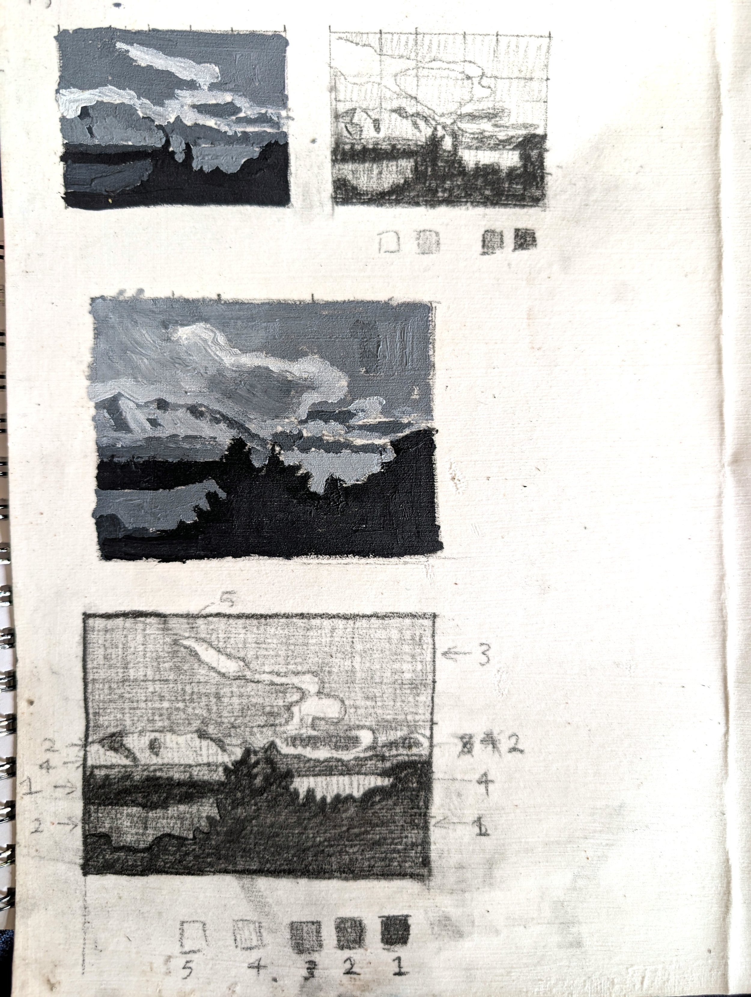 In these sketches I am organising and simplifying the values (shades of light and dark) in my composition. My emphasis is on the light hitting the clouds and mountains, so they are the lightest.