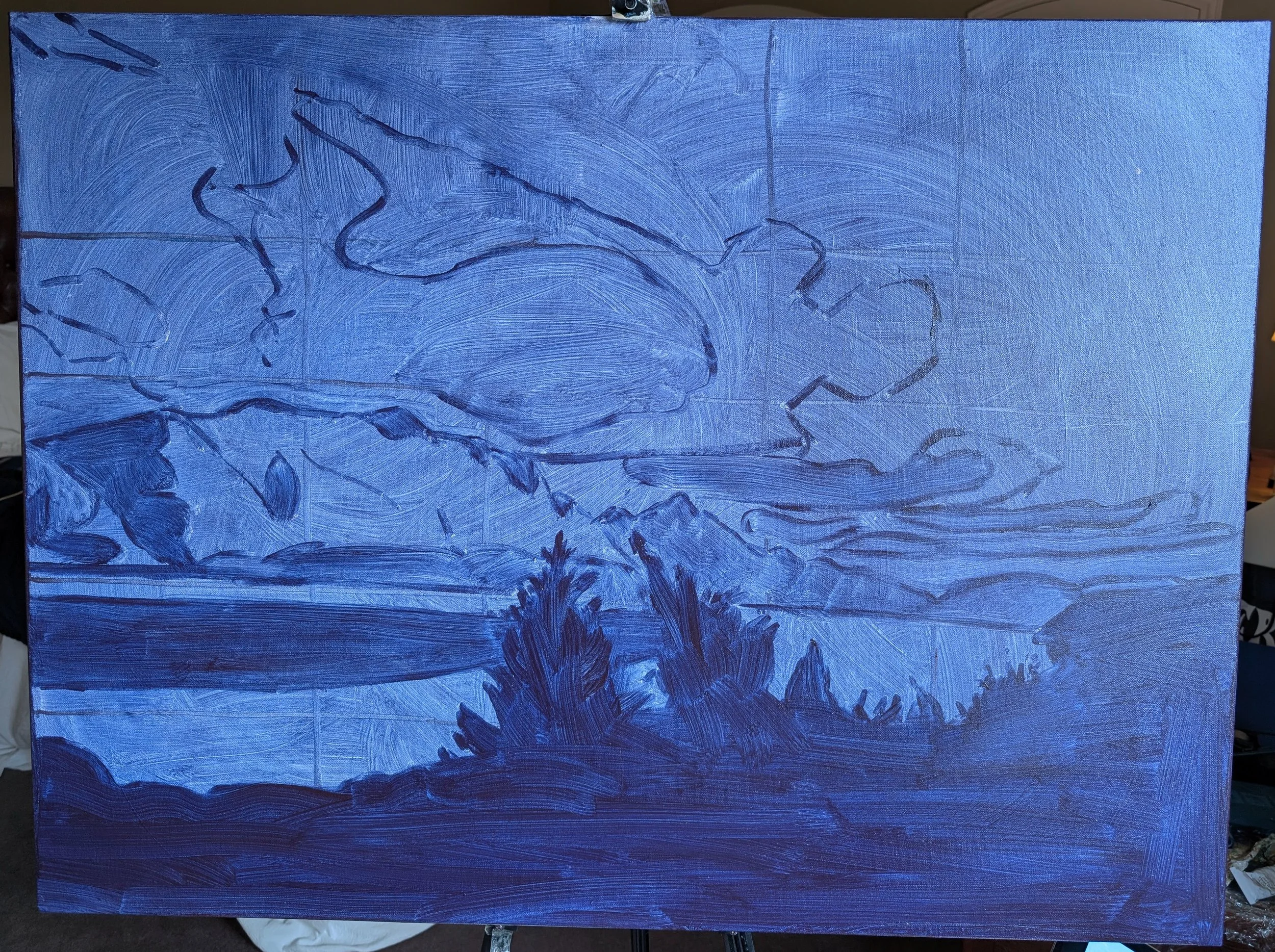 This is the first layer completed. I’ve used my studies to inform my colour choices and have started creating movement in the sky and clouds. From this point it’s much easier to judge values and colours against each other.