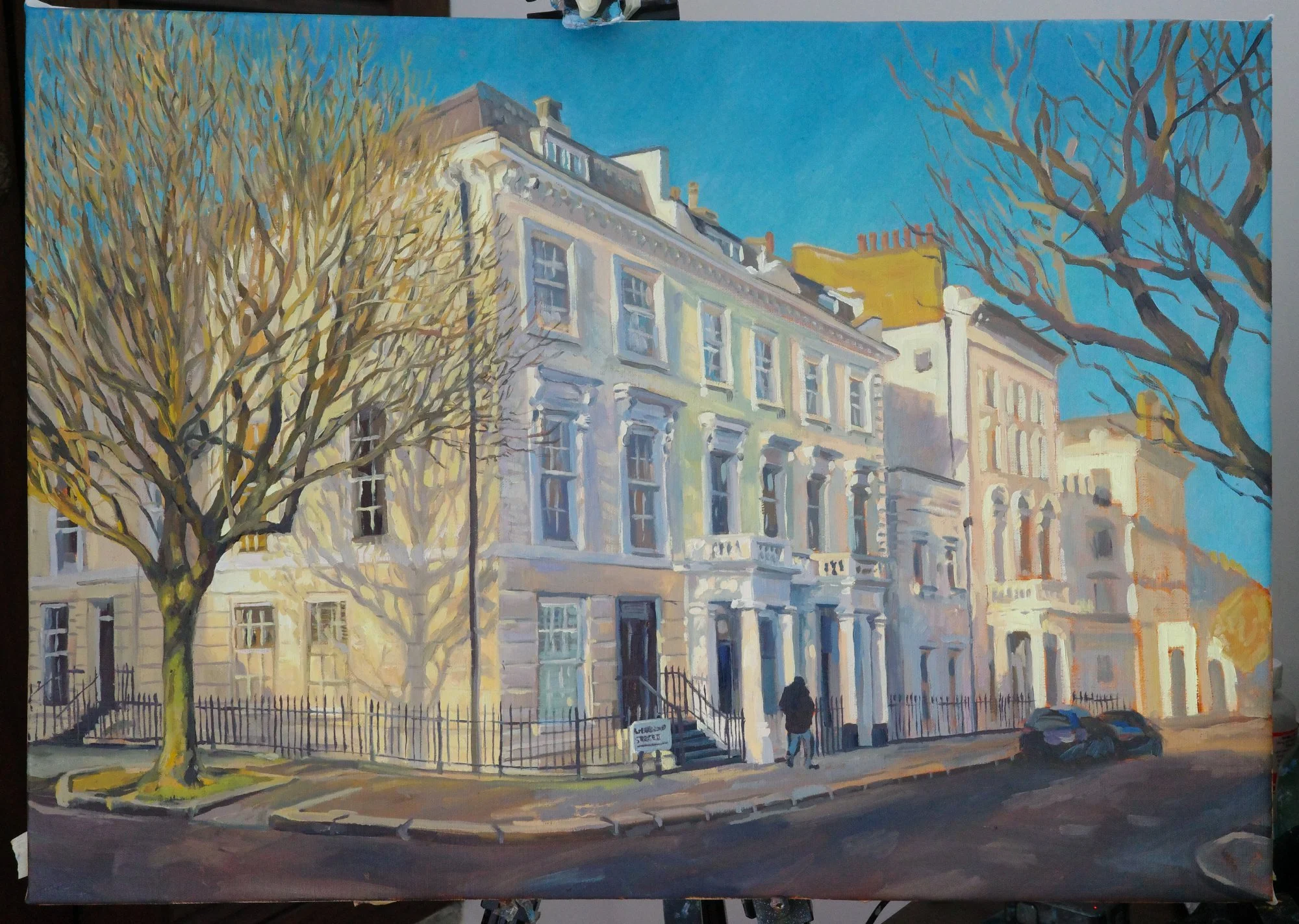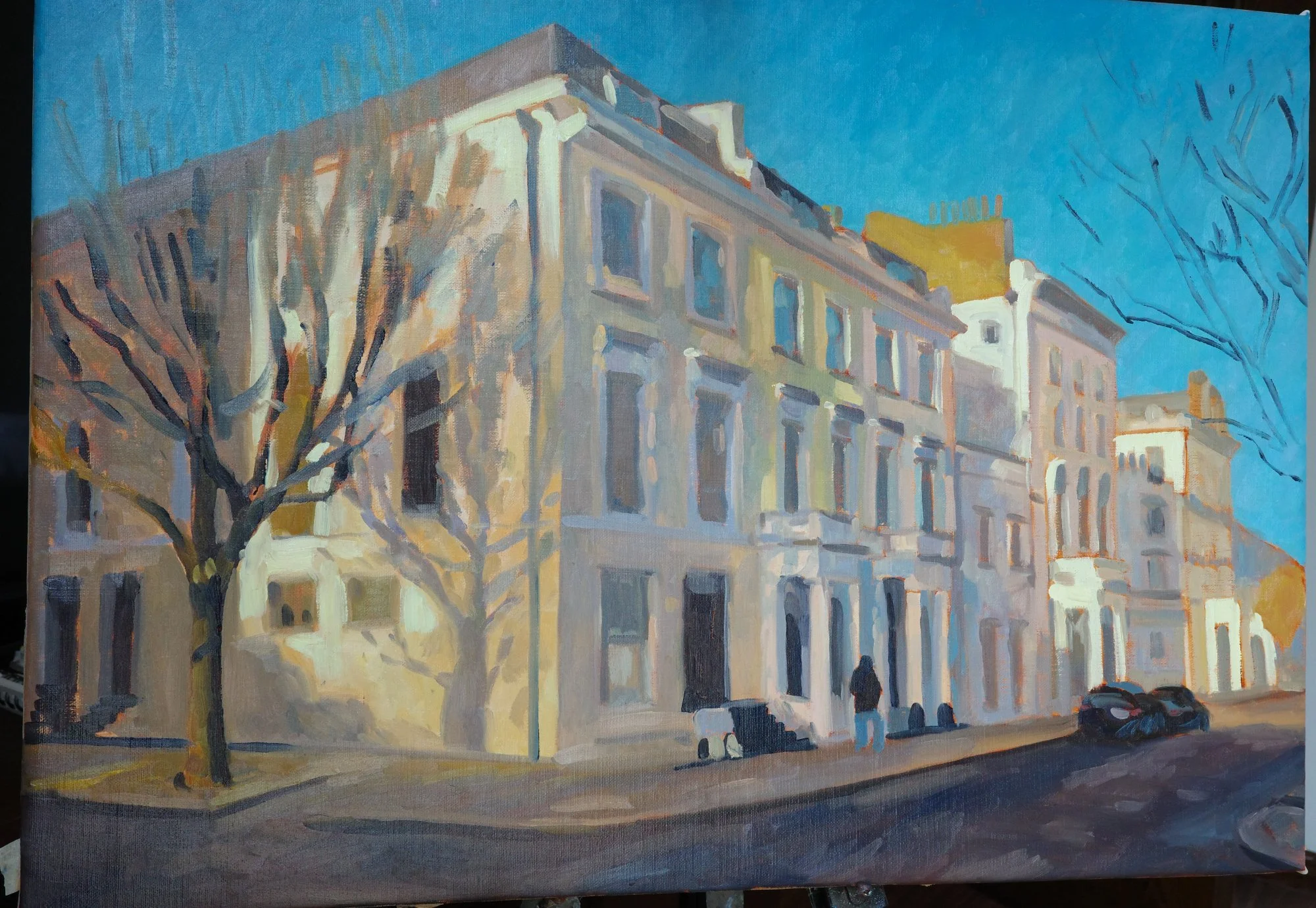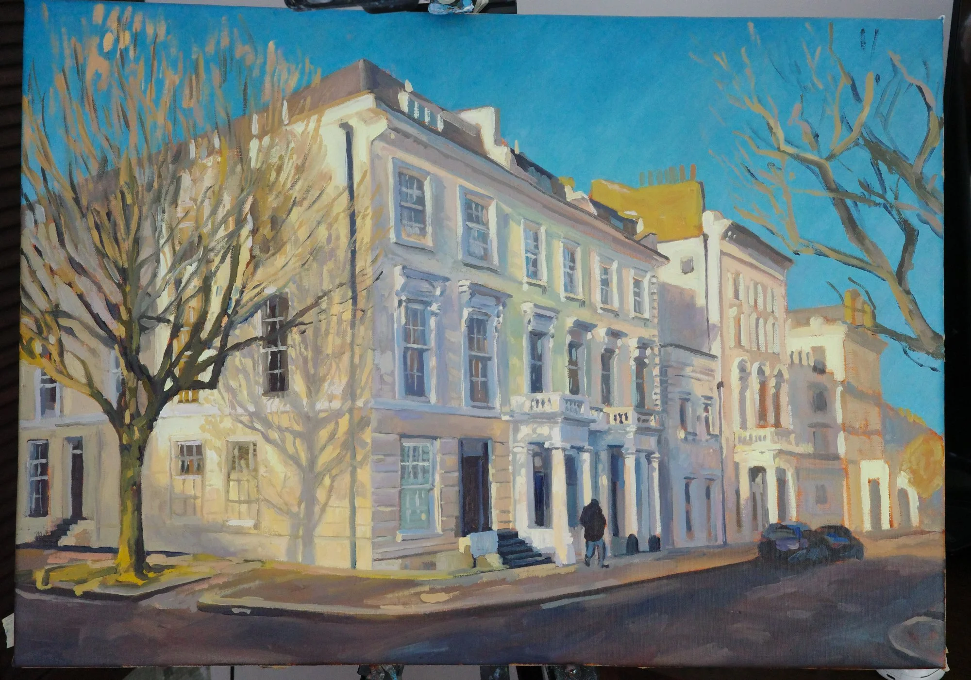 I loved mixing so many colours in this painting. I think it helped to create a glowing sense of light. The chroma is turned up, but it still feels like Pimlico on a winter’s afternoon. I’ll definitely be taking this joyful use of colour into my future work!
