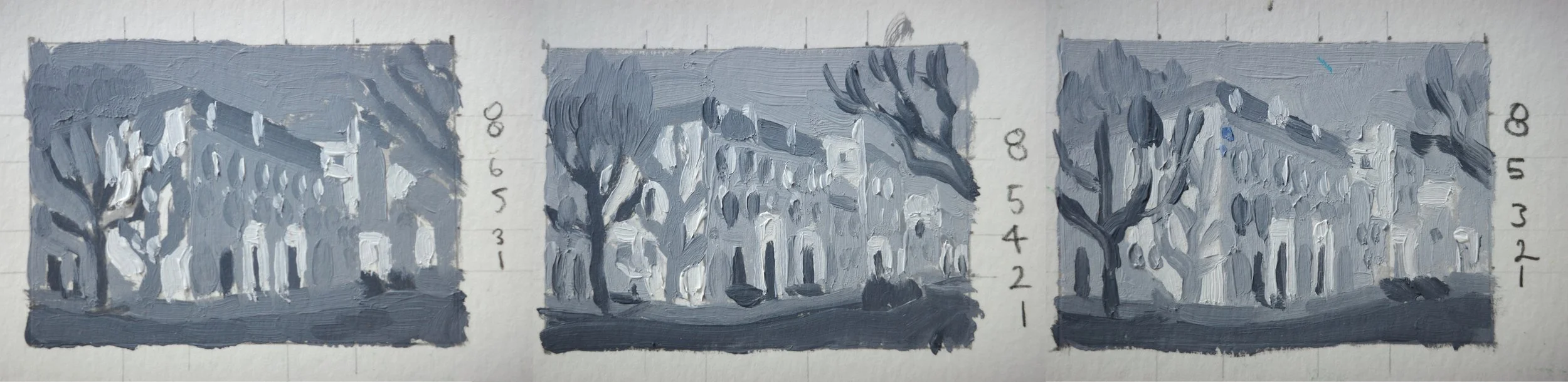 Next, I painted these three little value studies to work out where the darks and lights sit on a value scale. Getting the values right is what makes this kind of low winter light feel believable.