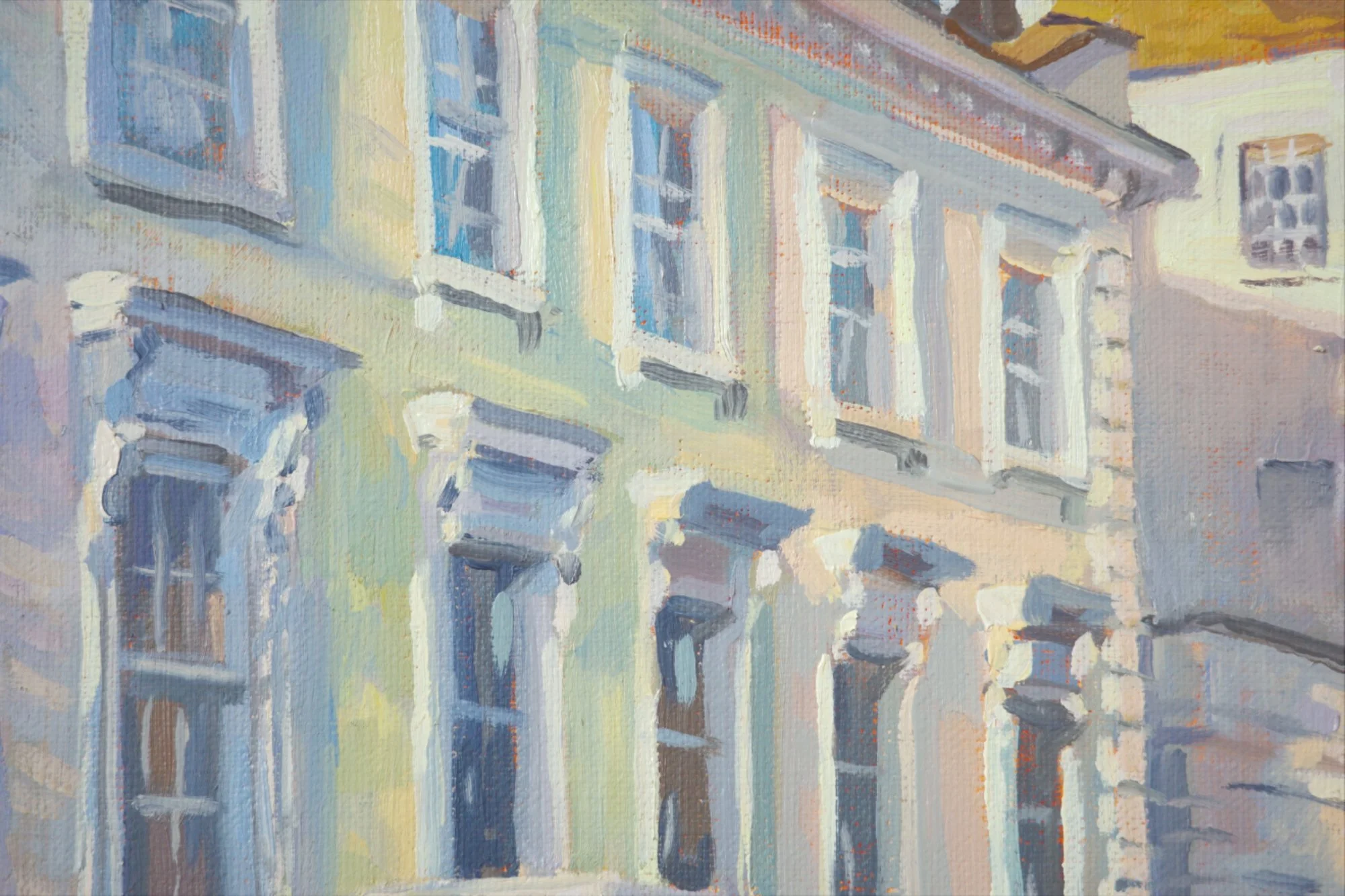 Here, I’ve started to bring the light into the painting, where it catches the edges of windowsills, stairs, porticos and roofs as it filters down the side of the building. This starts to create depth and texture across the surface.