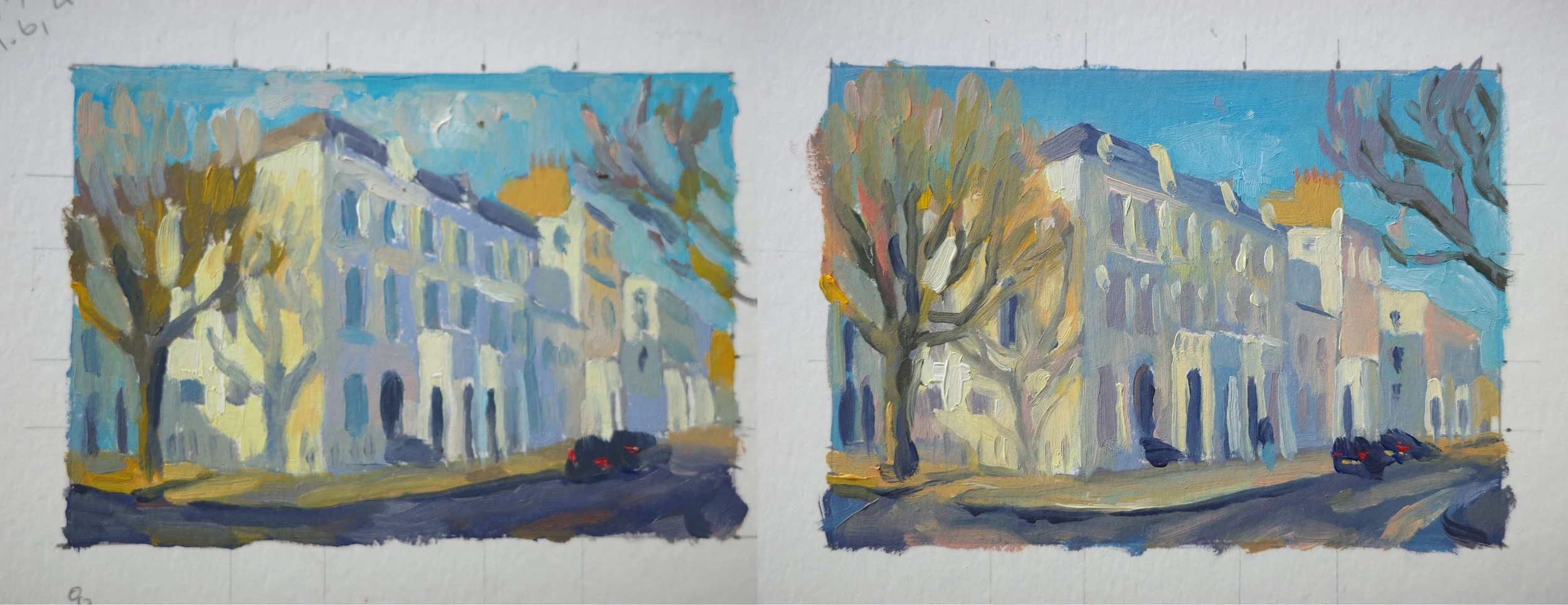 Finally, I started adding colour in these small simplified paint sketches. The consistent hints of orange on the trees, brickwork and cars, create balance through the painting. I particularly wanted to enhance the beautiful complementary opposite purple-yellow and blue-orange colour combinations in the scene.