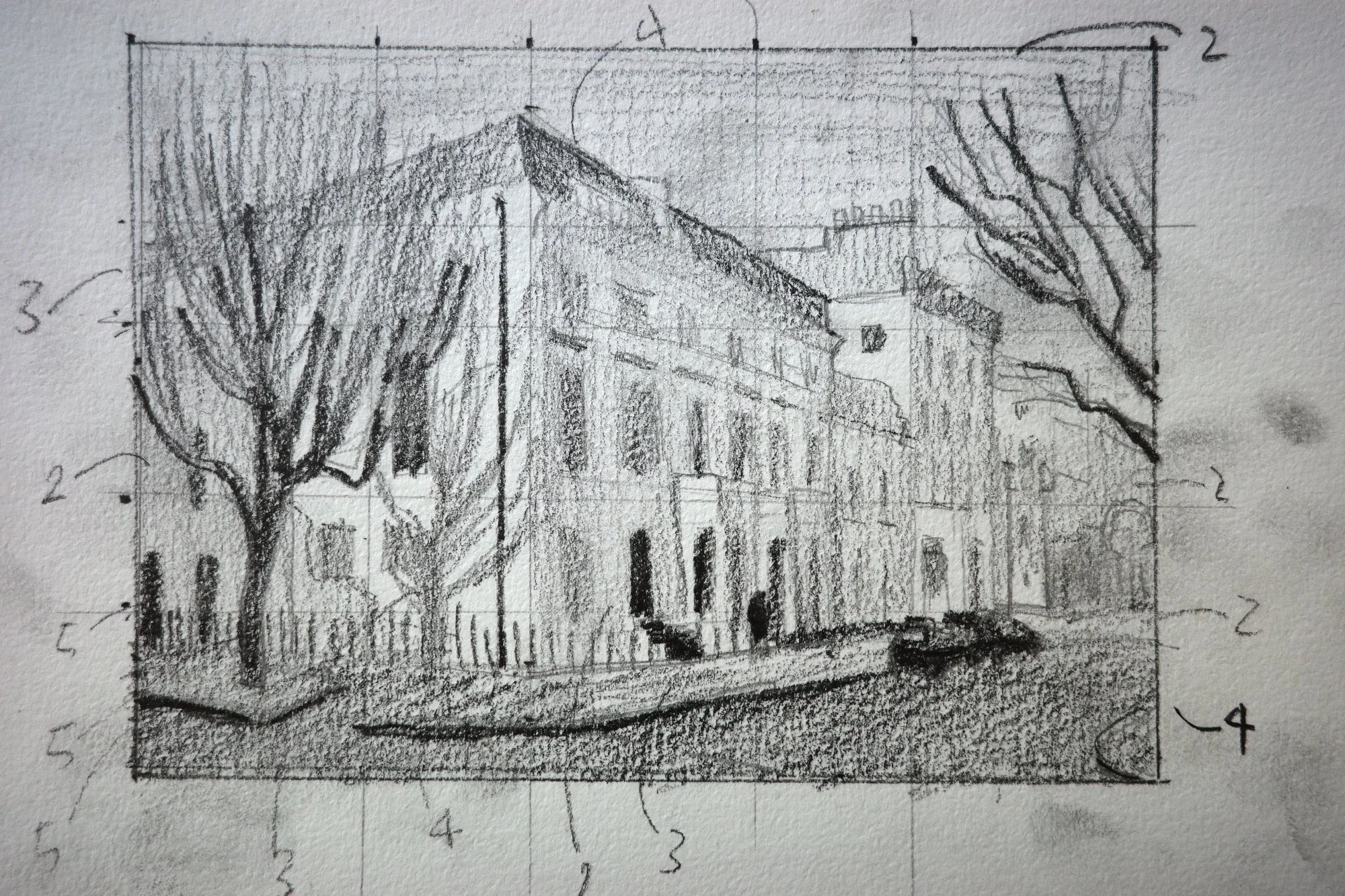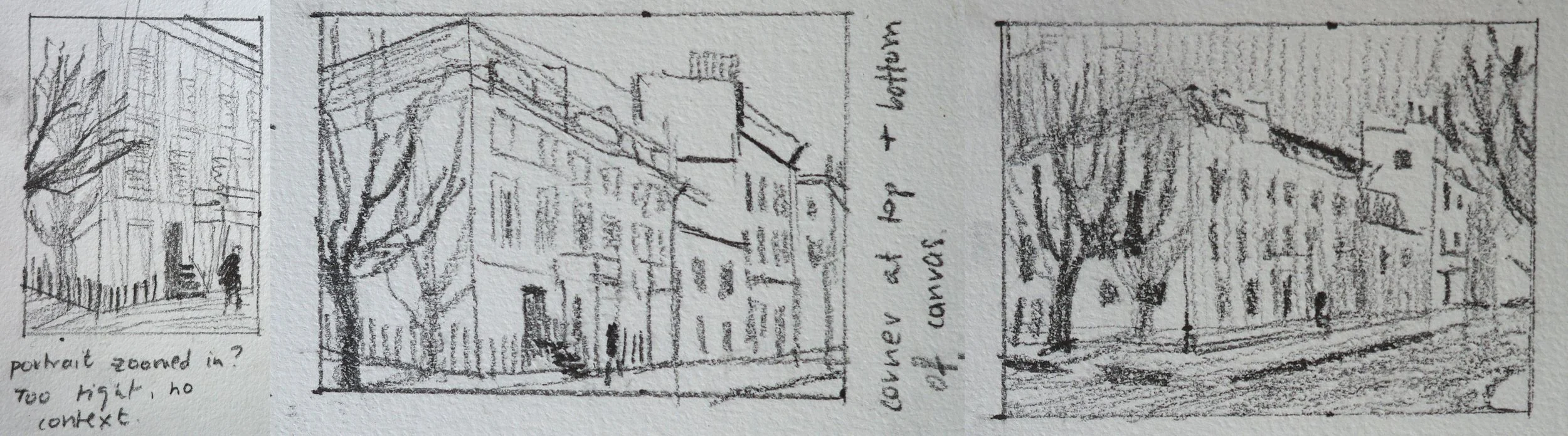 I spent a few hours drawing out this composition to make sure I got the perspective right and relationships between the value shapes correct. This is extra important when painting buildings so the structure holds together and the perspective feels convincing.