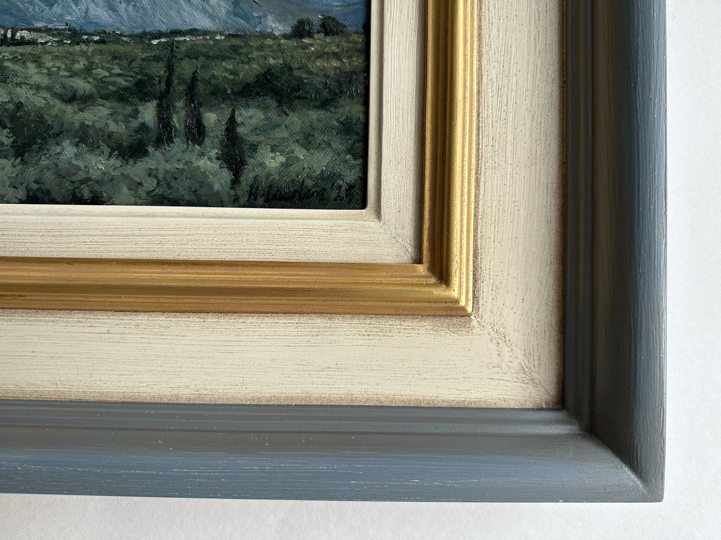 Each frame is handcrafted and hand-finished by my trusted framer. I’ll lead us through the design process to ensure the frame complements your painting beautifully.